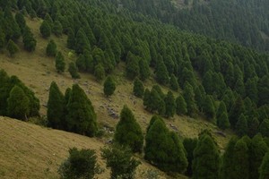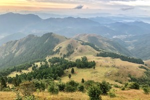 07:00 山顶有马和牛群,山顶大片的草原和杉木林,铺满茵茵绿草,杉木错落有致地散布山上,各种奇型怪状的石头镶嵌其中。