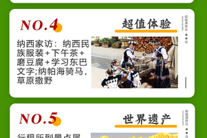 游览重点:滇金丝猴公园+长江第一湾+玉湖村家访(纳西服装+东巴文字体验+下午茶+磨豆腐)+束河古镇