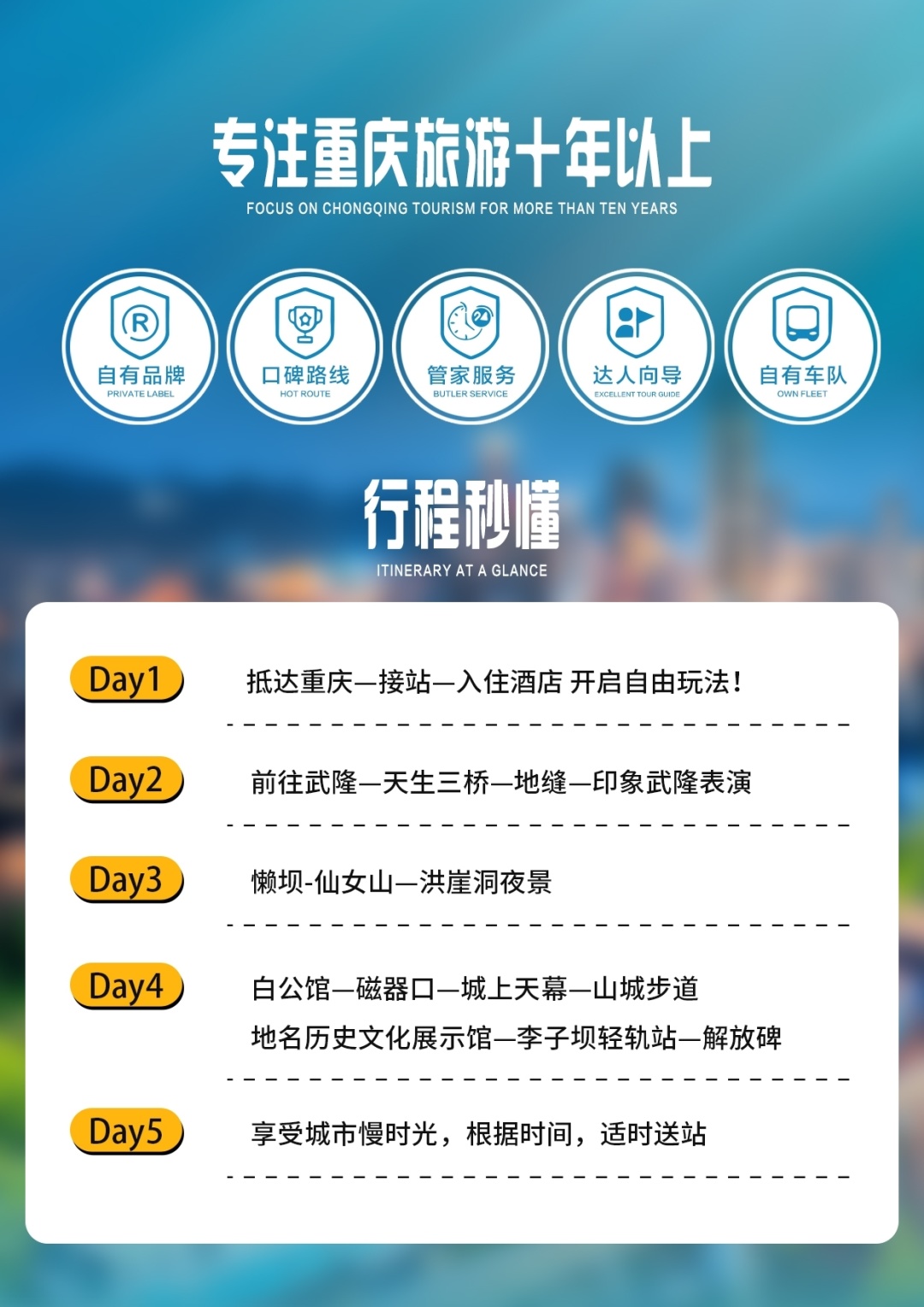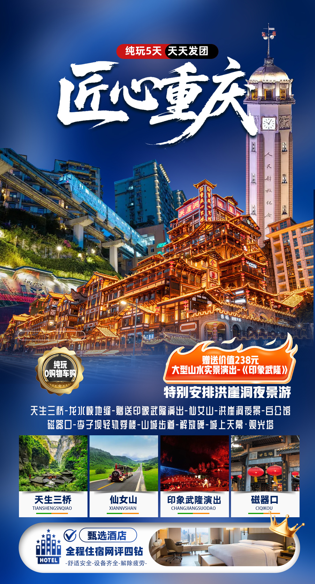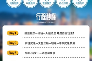★尊享住宿:甄选4晚网评4钻酒店,保障睡眠质量 ★尊贵体验:行程升级2+1保姆大巴车、头等舱座椅 ★巴渝美食:养生宴、蒸笼宴、特色乌江鱼、升级重庆火锅,4大美食风味餐,味蕾肆意撒欢 ★温馨服务:24小时管家服务,让游客更放心! ★品质奢享:100%真纯玩0购物0自费,1人也安排导游 ★深度游览精华景点一网打尽 【武隆天生三桥】【武隆仙女山】【龙水峡地缝】 【磁器口古镇】【解放碑】【洪崖洞夜景游】【李子坝轻轨穿楼】 特别赠送价值238元非物质文化遗产大型山水实景演出-《印象•武隆》