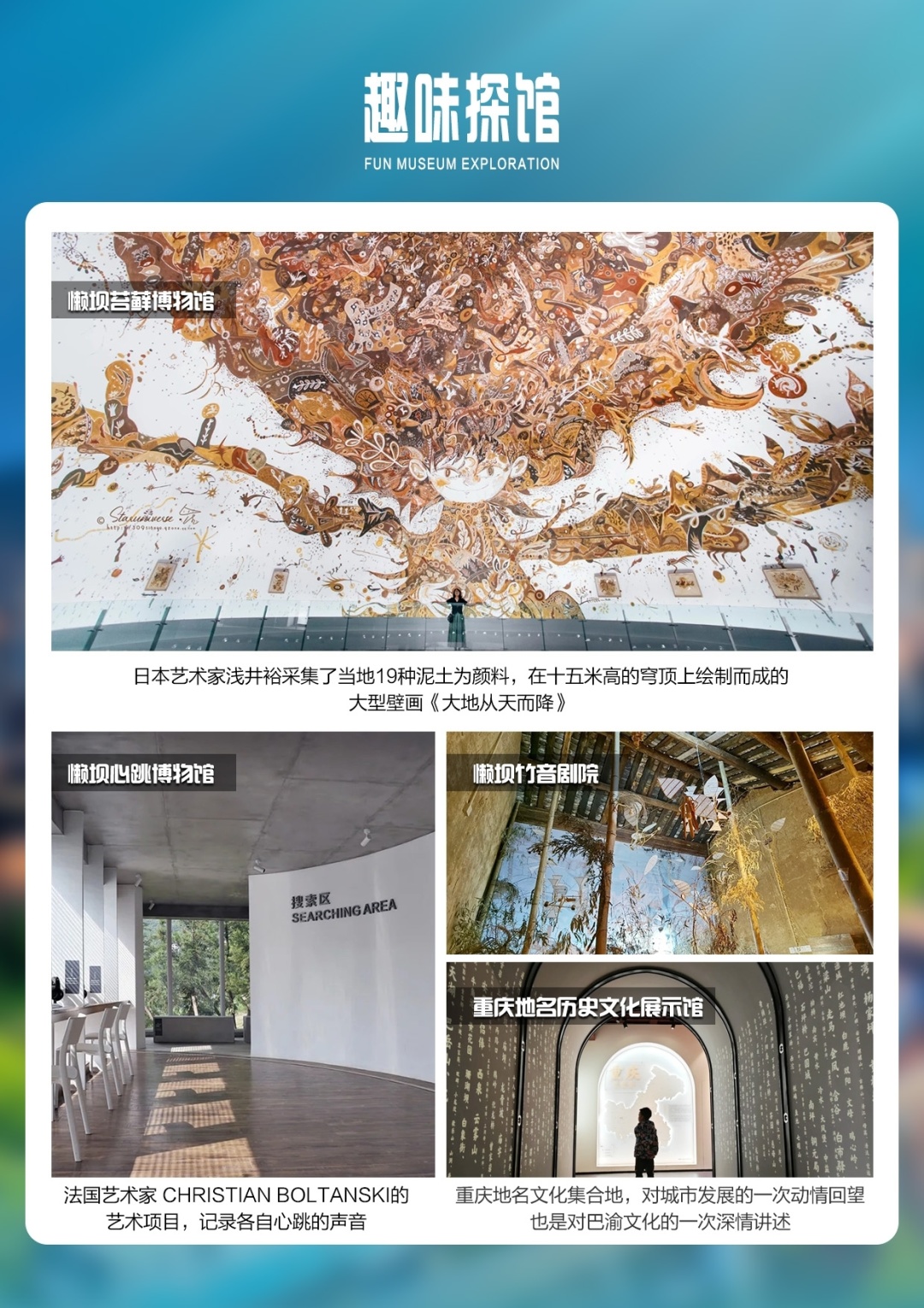 酒店早餐后,前往参观【懒坝国际文化中心】(游览1.5小时左右)懒坝融合当代国际艺术和禅修康养文化。景区内有-苔藓博物馆:苔藓馆是一组北欧精灵风格的建筑群落,日本艺术家浅井裕介用武隆当地泥土调制成颜料而创作的壁画《大地从天而降》;竹音剧院-当人们走进去,利用竹子制作的乐器会自动演奏;心跳博物馆-国内第一个也是唯一一个可以为心跳“拍张照”的心跳博物馆。还可参观目前全球最大的琉璃佛像—药师佛塑像,琉璃宝殿内部为全琉璃打造,光影澄澈,流光溢彩。大雄宝殿内没有一尊佛像,六座配殿环抱着中央的穹顶主殿,纯净的蓝光充满室内,用光影打造冥思之境,照鉴本心。