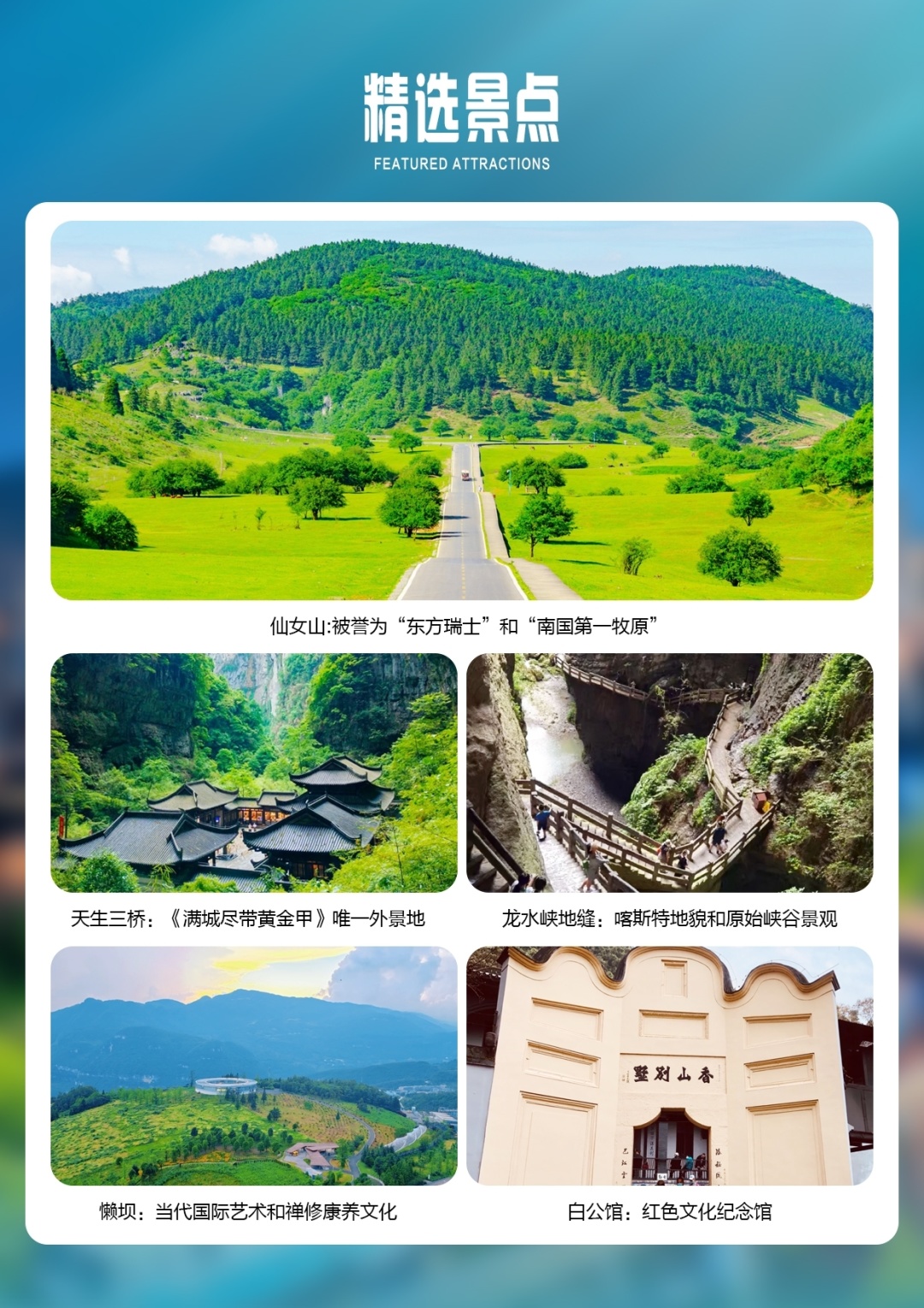 【安全说明】:1、旅行社的导游人员和其他工作人员无法为游客提供一对一的服务,旅行社工作人员在接待游客报名时已经充分告知本行程中的注意事项和对游客身体健康的要求,旅游活动中游客必须注意自身安全和随行未成年人的安全,保管好个人财务,贵重物品随身携带;2、沿途停车加水或上厕所等任何一个停留地点,请你上下车注意脚下、头顶及周边安全,不要在汽车道公路边崖边活动停留;3、景区属高山气候,早晚温差较大,请客人备外套、防晒霜、伞、常用药品等;景区内沿途有许多陡峭的台阶以及浮桥、栈道,请务必注意安全,老人和小孩须有家人陪同;