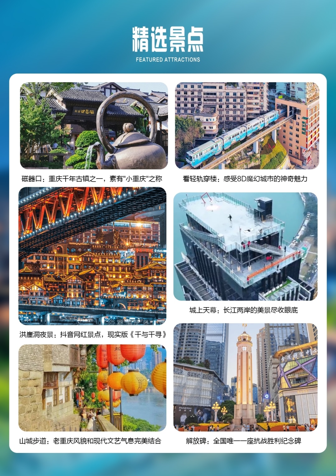 第四天:白公馆-磁器口-李子坝轻轨穿楼-解放碑-山城步道-城上天幕•观光塔