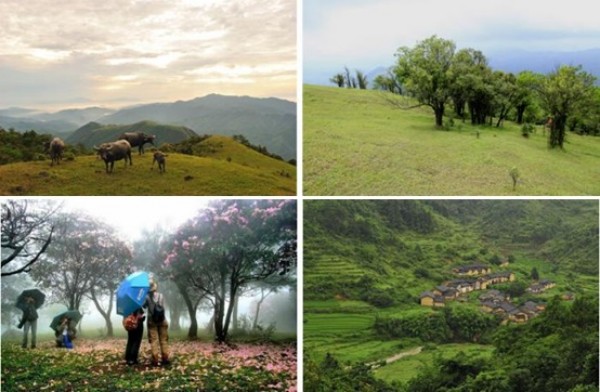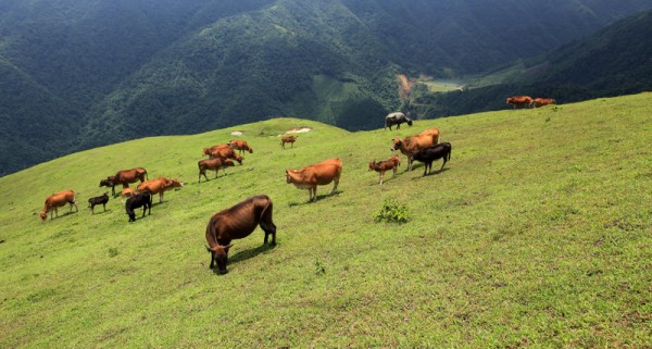 山顶每逢农闲时节,牛群三三两两悠闲自在地漫步和吃草,仿佛置身于世外桃源。