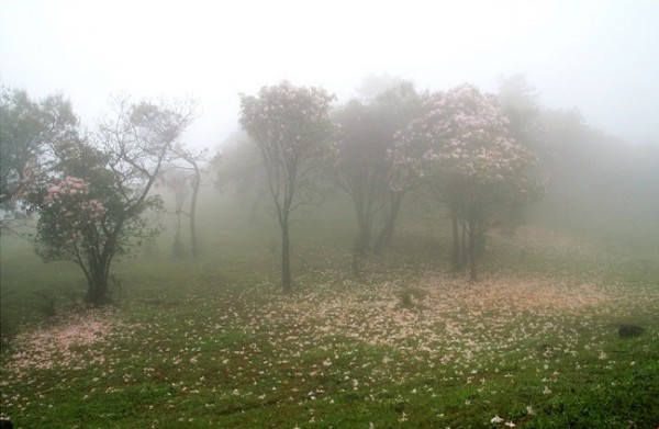 山上奇石满布,怪树丛生,并时常云遮雾绕。