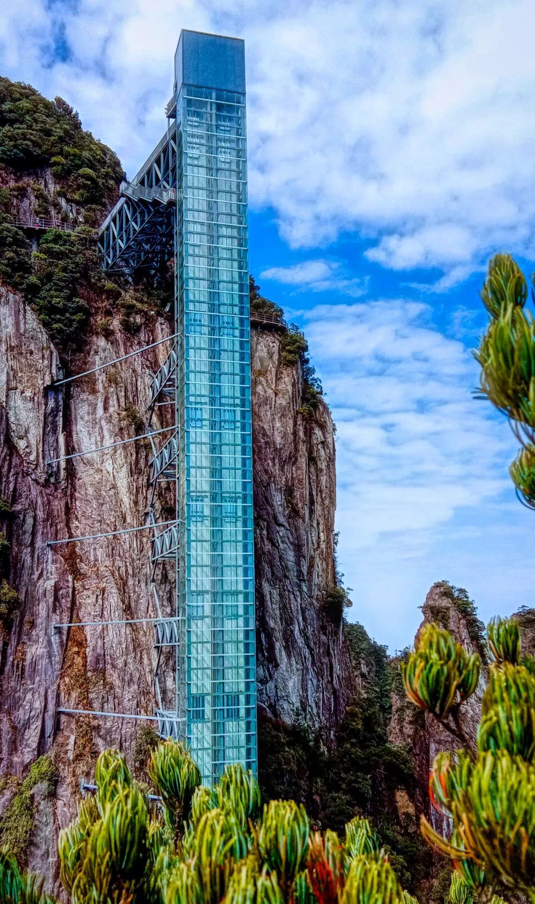 13:00 体验垂直观光电梯(电梯不含在大门票里面,建议乘坐,自理费用:单程40元/人),沿着悬空栈道一路经过金鞭大峡谷-东天门-七星崖-大天台,大天台号称“中南第一险”,运气好可以看到壮观的云海奇观;