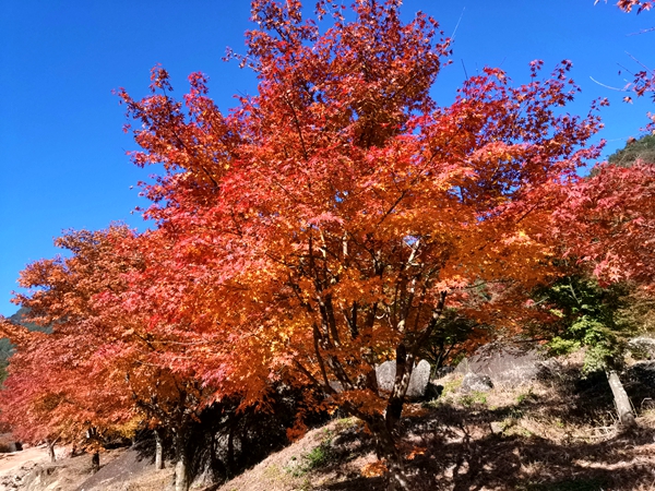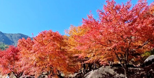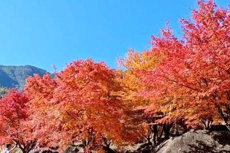 12:30 到达【十里枫叶林】,抬眼望去,层层叠叠的枫叶红得浓烈,红得似火,染红了山谷,染红了山涧,就像一条鲜红的地毯铺在蜿蜒曲折的山谷中,美轮美奂,美不胜收。