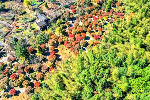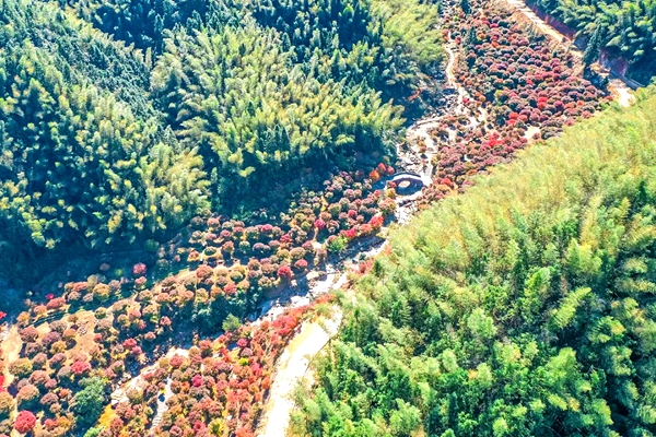 从高空俯瞰,火红的枫叶与竹林山色构成了一幅秋日“枫”景画卷。