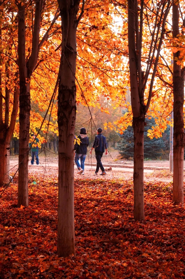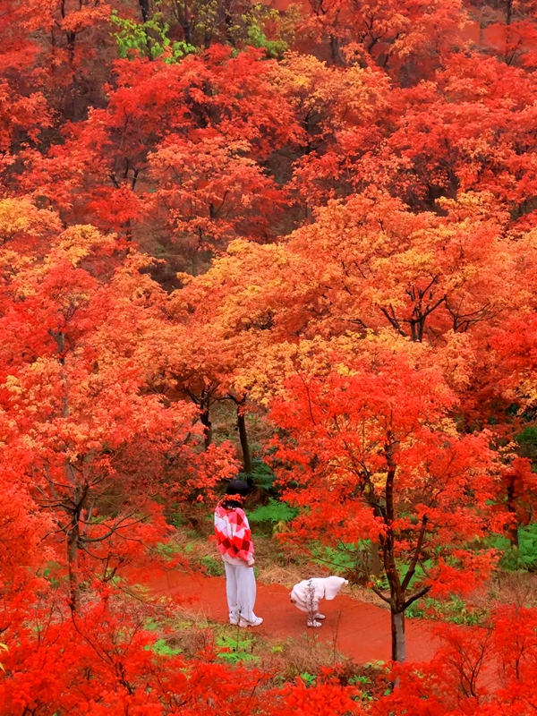 漫山的枫叶里,深红、粉红、橙红、橘红,层次分明