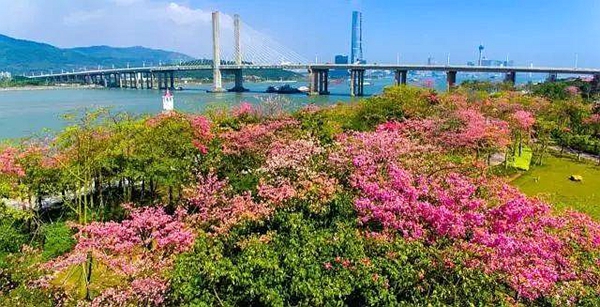 与澳门一海之隔拥有美丽的花海景观,根据不同花期,种植有樱木棉、凤凰木和木棉等。