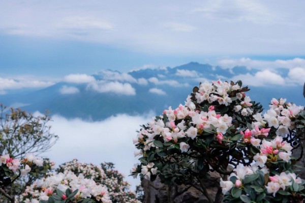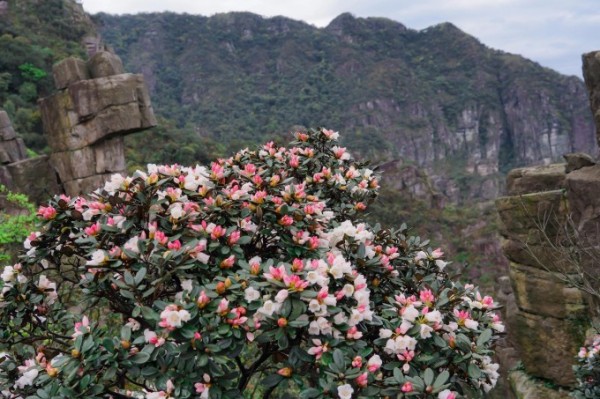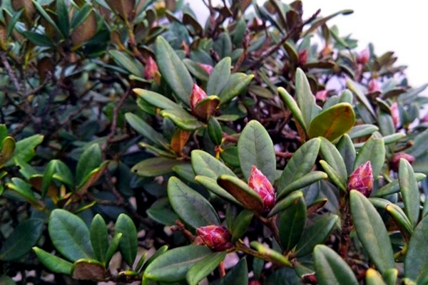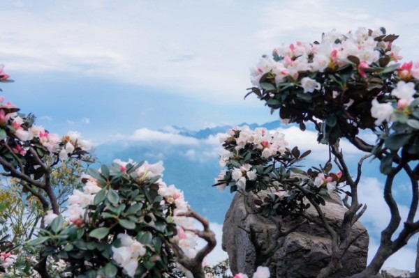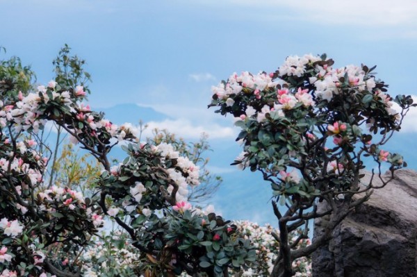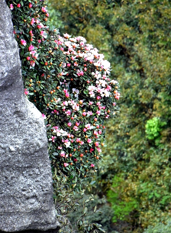 茶岩顶的高山杜鹃,叶革质,枝苍劲有力,高一米左右的灌木,也许这是高山杜鹃的通性,耐寒,抗风。但她的花色很特别,花蕾成红色,含苞成粉色,待完全盛开了却是白色,一株杜鹃树上开与不开,红粉白相间着。好些是日常难见的,不知叫什么。