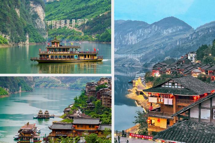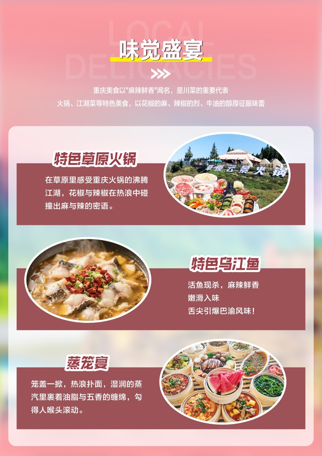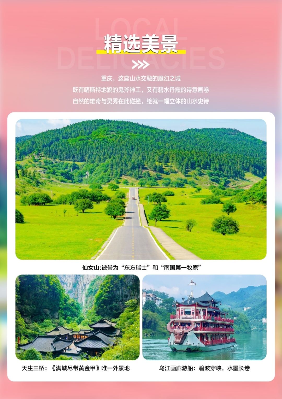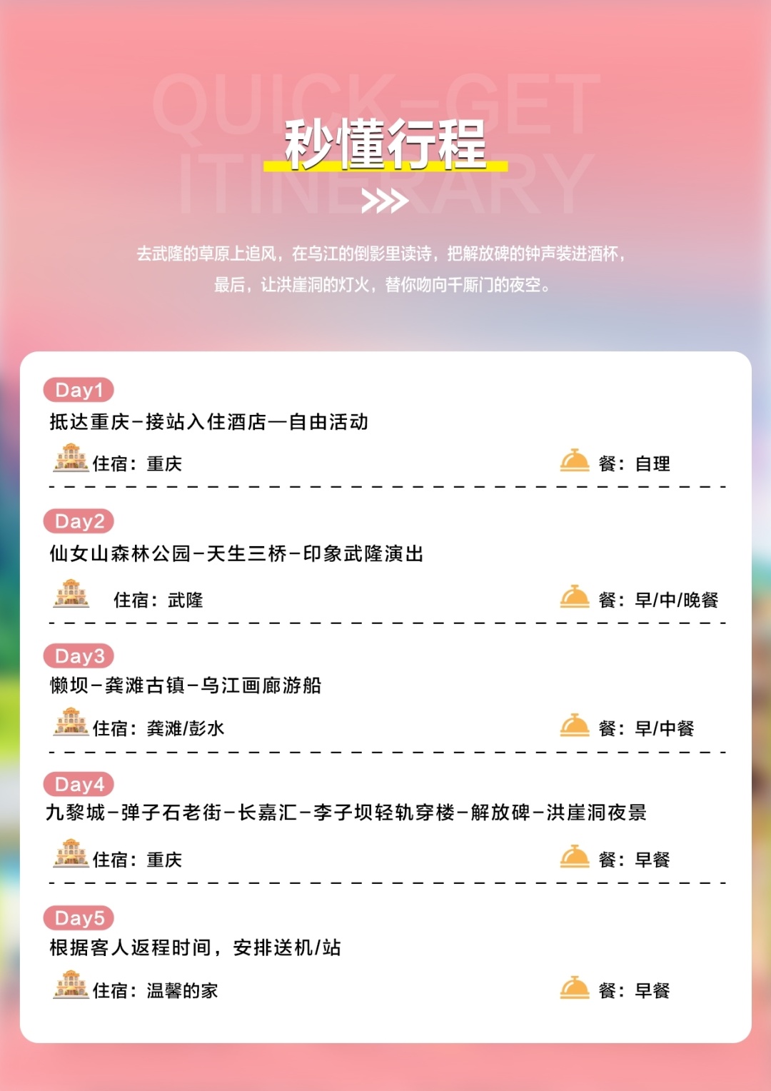 活动详情 第一天:广州/深圳>>>重庆接站>>>入住酒店自由活动 早餐:× 中餐:× 晚餐:× 住宿:重庆 请您根据机票起飞时间提前2小时自行乘车到深圳/广州机场,凭身份证领取登机牌,之后前往美丽的山水之城、富有活力的中国西部魅力之都【重庆】,抵达后安排接机/站(期间无导游),送至指定酒店入住(游客在酒店服务台报姓名,凭二代身份证办理登记入住手续)。出站口仅供临时停靠,需步行前往集合点上车,请理解 温馨提示: 1、今日无行程安排,不含餐及导游服务。酒店办理入住后,如果时间充分,可自由活动品尝当地美食。 2、导游将在晚18:00-21:30之间短信或电话联系您第二天早上出发时间、集合地点、请您注意查收短信或接听电话,保持电话畅通。 第二天:酒店---武隆5A天生三桥---5A仙女山 早餐:酒店提供 午餐:特色草原火锅 晚餐:蒸笼宴 住:武隆 酒店用早餐,后乘车前往武隆(高速路行驶时间3小时左右),抵达后享用午餐—特色草原火锅。餐后前往游览国家AAAAA级风景名胜区【天生三桥】(游览时间不低于90分钟)(统一乘坐换车进入景区,必须乘坐)景区以其壮丽而独特的“三桥夹两坑”景观称奇于世。世界最大天生桥群和世界第二大天坑群相映生辉,坑与坑之间以桥洞相望,桥与桥之间以坑相连,规模宏大,气势磅礴,瑰丽壮。是张艺谋06年电影大片《满城尽带黄金甲》唯一外景地,亲临拍摄地、观看投资200万修建的唐朝古驿。 随后乘车前往国家AAAAA级风景区【仙女山国家森林公园】(游览时间不低于90分钟)仙女山平均海拔1900米,以其独具魅力的高山草原被誉为“东方瑞士”和“南国第一牧原”,其旖旎美艳的森林草原风光在重庆独树一帜。抬头便可见蔚蓝天空与朵朵白云,走进33万亩森林和十万亩草场形成的巨型“氧吧”,感受渗进皮肤的丝丝凉意与沁人心脾的草原清新。 尊享礼遇-观看大型山水实景演出—【印象▪武隆】(演出时间不低于70分钟)艺术和自然于天地之间,100多位特色演员现场真人真情献唱,聆听川江号子的荡气回肠,感受纤夫之爱,即使千百年的记忆远了,但现代文明与传统文化却相融了 若因政策原因不能参加或自身原因放弃参加,无任何退费不换等价项目。 景点时间安排及用餐仅供参考,在不减少景点和用餐的情况下,导游可根据实际情况调整景点游览先后顺序和用餐顺序 第三天:懒坝-龚滩古镇—乌江画廊游船 早餐:酒店提供 午餐:特色乌江鱼 晚餐:自理 住:龚滩/彭水 酒店早餐后,前往参观【懒坝禅意文化中心】(游览时间不低于90分钟)懒坝融合当代国际艺术和禅修康养文化,结合当地喀斯特地貌风光,为游客营造独特的心、灵、身体验式度假旅程。总占地面积144亩,有2个世间之最,值得大家看,第1个,用35万公斤琉璃打造了目前为止全球最大的琉璃药师佛像和殿堂。第2个,目前为止全球最大的蓝光殿,是一个穹形的圆顶,里面没有一根柱子,只有一片纯净的蓝光,用光影打造出了冥思之境。 乘车前往游览被誉为乌江上的“璀璨明珠”【龚滩古镇】古镇现存长约三公里的石板街、150余堵别具一格的封火墙、200多个古朴幽静的四合院、50多座形态各异的吊脚楼、独具地方特色,是国内保存完好且颇具规模的明清建筑群。 乘坐【乌江画廊游船】(费用自理 乘坐时间约60分钟)乌江属于重庆的第三江,也是长江上流重要的支线,江水因矿物质的呈现会显得额外的翡翠绿,在峡谷大山的怀抱中静静的躺着,如山水画一般唯美,壮观。 时间安排仅供参考,在不减少景点的情况下,导游可根据实际情况调整景点游览先后顺序。 温馨提示:今日住宿根据酒店房间数量调整地点,入住龚滩为江景特色客栈,入住彭水为携程四钻酒店。 第四天:4A九黎城-【弹子石老街】+【长嘉汇春晚重庆分会场】+李子坝轻轨穿楼-解放碑-洪崖洞夜景 早餐:酒店提供 午餐:自理 晚餐:自理 住:重庆 酒店早餐后,前往游览国家AAAA级旅游景区【蚩尤九黎城】(游览时间不低于120分钟) 前往游览国家AAAA级旅游景区【蚩尤九黎城】(游览时间不低于120分钟)景区以苗族始祖蚩尤文化为主线,由40余处单体景观建筑构成。主要包括标志门楼、九道门、九黎宫、九黎部落、九黎神柱、苗乡非遗博展馆等建筑,在展览馆内不仅可欣赏到苗族民歌、高台狮舞、木腊庄傩戏等动态非遗展演,还可看到苗族银饰锻造、苗绣、蜡染等技艺的展示和传承,并可亲手参与制作,体验非遗技艺的乐趣,感受苗族文化的独特魅力。(景区有配套非遗工艺品及首饰销售,不属于旅行社指定购物店,不作为投诉依据) 打卡网红景点【弹子石老街】+【长嘉汇春晚重庆分会场】(游览时间不低于60分钟)弹子石老街是重庆能同时“观两江”、“看三桥”、“览三地标”的地方,登上拥有270度广阔的观景视野“两江汇观景平台” 可横看整个渝中半岛以及江北片区。 体验乘坐【李子坝轻轨穿楼】(游览时间不低于20分钟)轻轨能在天上走?竟能从一栋居民楼里穿过?李子坝轻轨站体现了重庆城和山的完美结合,重庆轻轨也被网友称为神一样的交通,90度过弯,跨江穿楼,上天入地,比过山车还有意思,看轻轨穿楼而过,亲身体验这座8D魔幻城市的神奇魅力。 游览“成渝十大文旅新地标”【解放碑】(游览时间不低于30分钟)1947年8月落成,是抗战胜利的精神象征,是中国唯一一座纪念中华民族抗日战争胜利的纪念碑,位于重庆市渝中区解放碑商业步行街中心地