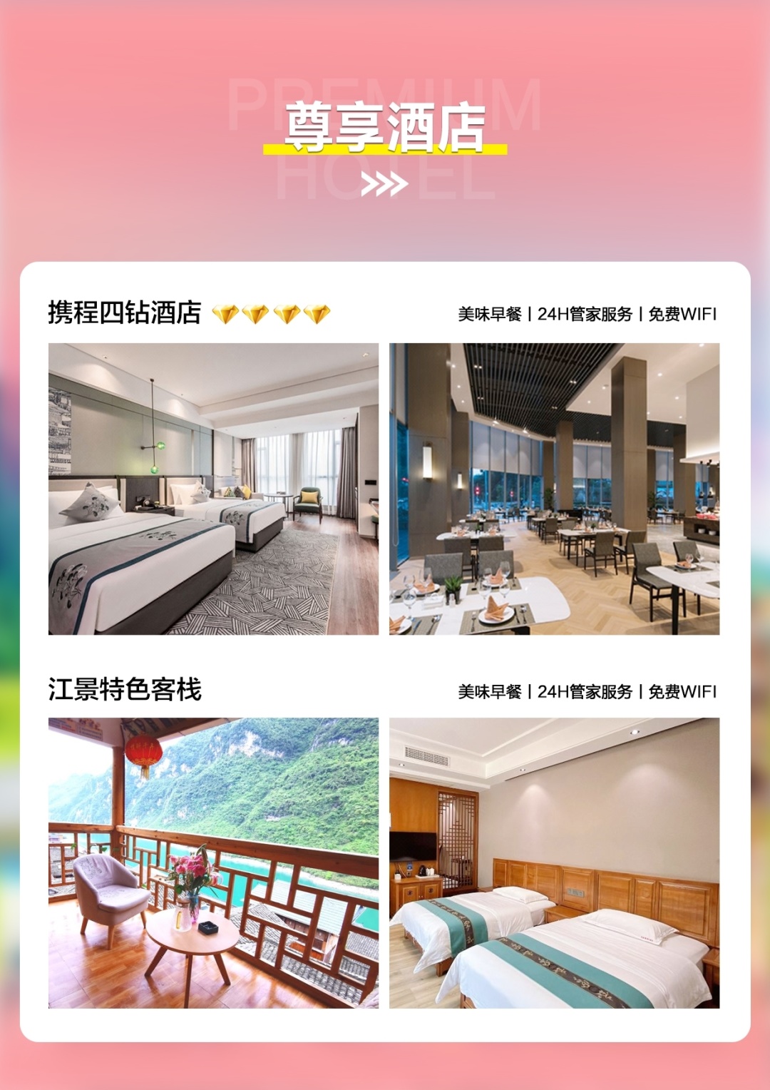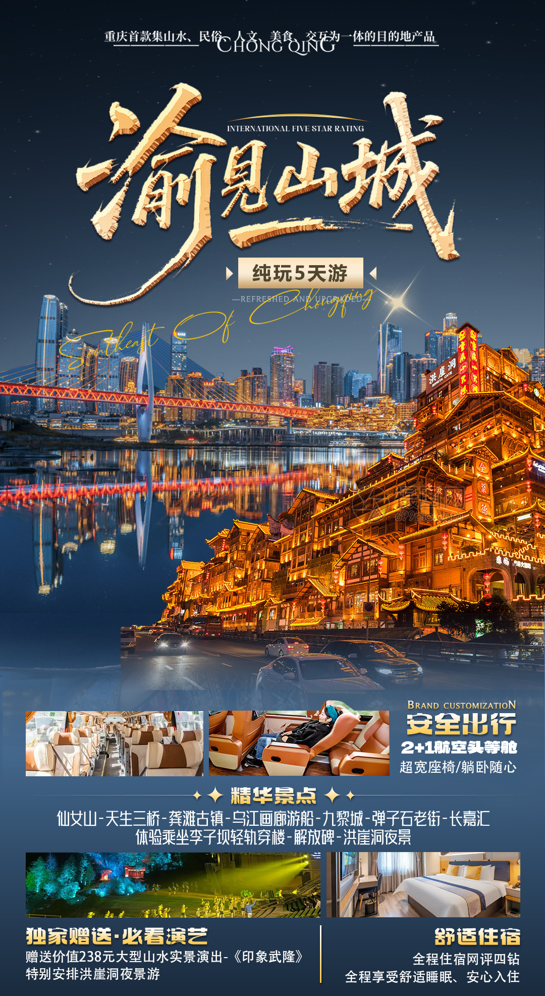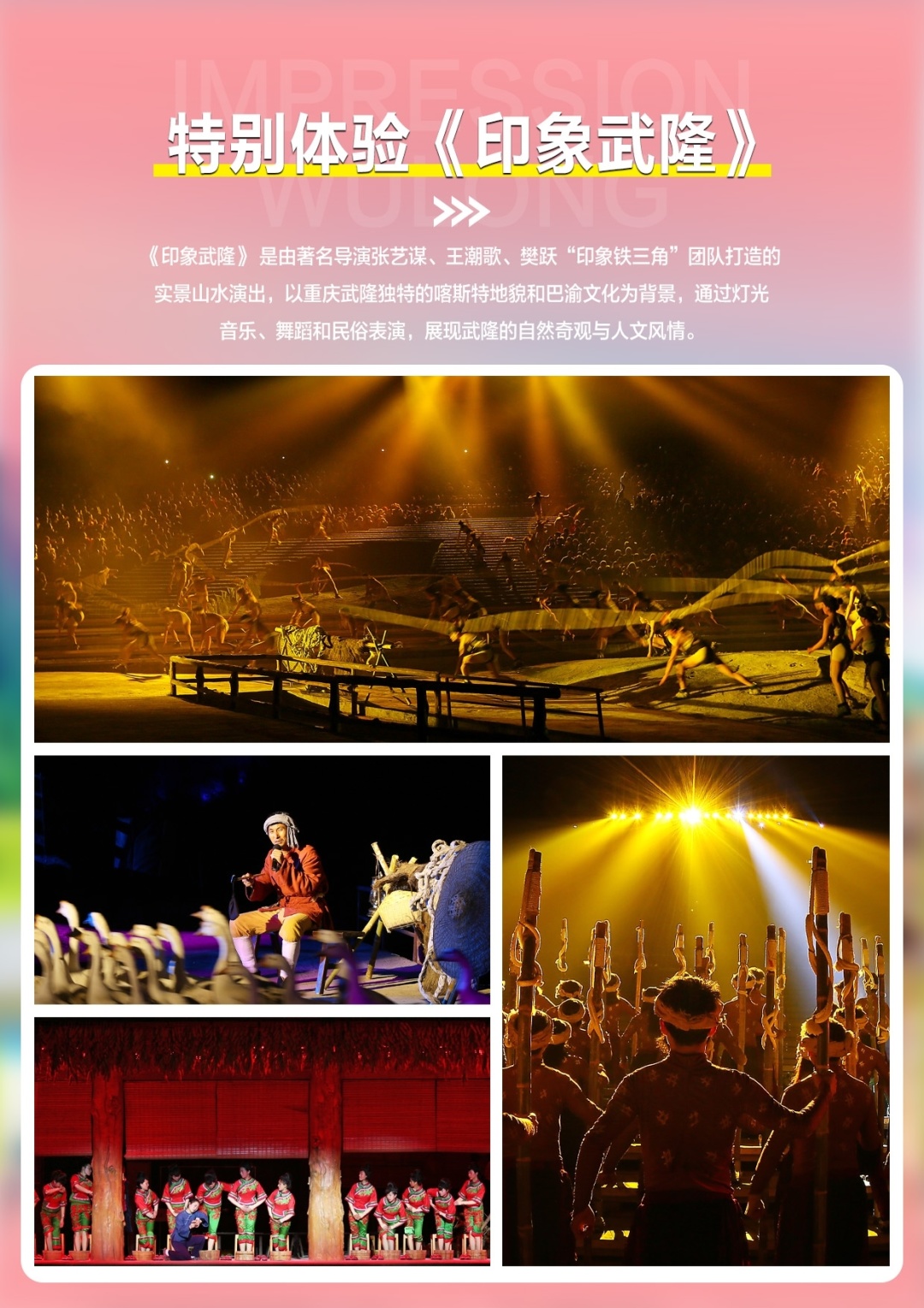 活动特色 ★尊享住宿:全程四晚网评4钻酒店或3晚网评四钻+1晚江景特色客栈 ★尊贵体验:行程升级2+1保姆大巴车、头等舱座椅 ★巴渝美食:升级1餐重庆特色火锅 ★温馨服务:24小时管家服务,让客人更放心! ★重庆洪崖洞+解放碑+李子坝轻轨穿楼+天生三桥+仙女山+蚩尤九黎城+龚滩古镇 深度游览精华景点一网打尽 尊享礼遇-观看价值238元非物质文化遗产大型山水实景演出-《印象•武隆》