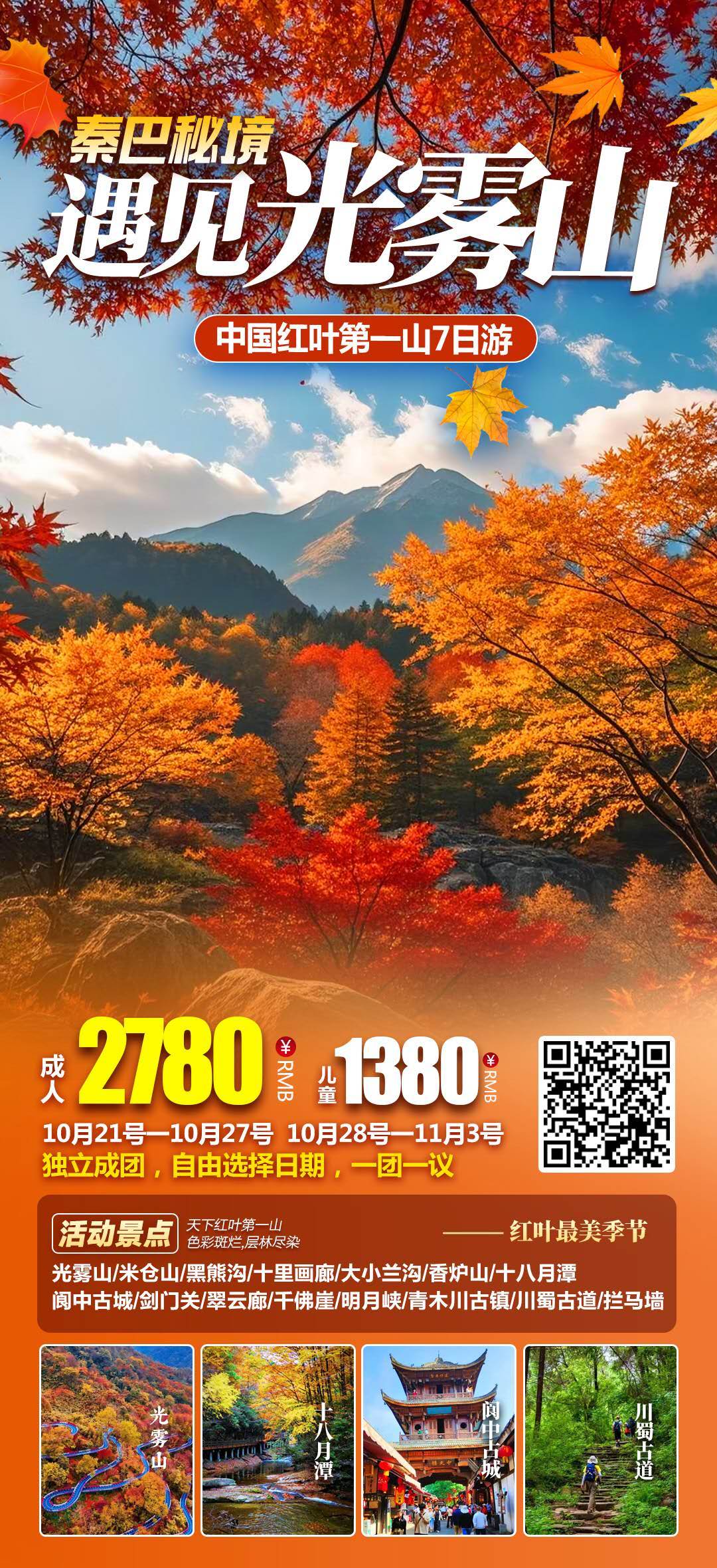 7点早餐后前往米仓山景区,光雾山看红色其实并不是在光雾山,而是光雾山里面的米仓山,今天一早我们将前往光雾山【米仓山】观赏顶尖秋色红叶,清晨的雾气最为美妙,如同白纱一样轻轻笼罩,仿佛真的来到了仙境。大片大片浓厚的云朵就像棉花糖,在微风拂绕中变幻成各种图案。眼前林海相接,云雾蒸腾,别有一番风味在其中。顺着路线来到【天然画廊】,它是四川省100个最美观景拍摄点之一,随后前往【黑熊沟】,这里的溪水是迷人风光中不可或缺的一部分,尤其两旁树上的红叶倒映在水中,风一吹便随着水中波纹晃动,十分美妙。随后再来到【大小兰沟】,喜欢拍照的小伙伴注意了,这里青石苔藓和飘落其上的红叶,构成了秋天最美的图卷。溪水曲折蜿蜒缓缓流淌,水流不大适合下沟游玩,尽情玩耍一番,内心烦闷早已一扫而空。