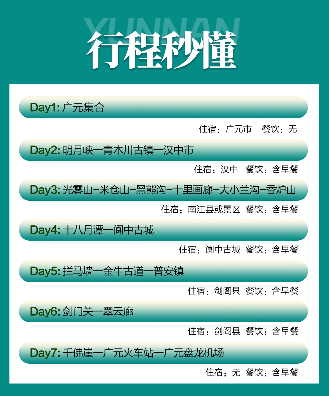 7点早餐后,前往千佛崖景区,千佛崖摩崖造像始凿于北魏晚期,当时佛教传入中国,在中原地区逐渐兴盛,广元作为连接中原和四川的交通要道,佛教也随之传入,北来南往的僧人在此驻扎,结庐修行,开窟造像,游玩2小时之后,11点开始送站,11.30分到机场,12点到火车站,这次的行程完美结束,大家各自返回温馨的家。