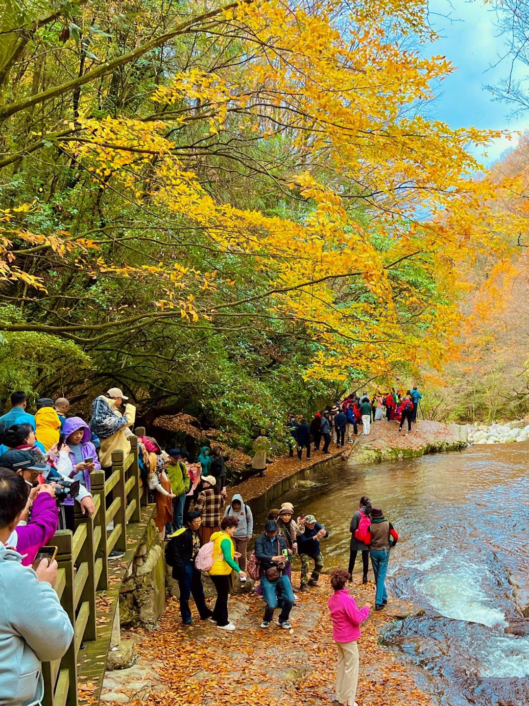 今天要去的【十八月潭景区】距离稍远,辛苦大家早起。不过路上处处是风景,大片红叶在车窗外穿梭而过,车辆仿佛行驶在画卷中,如斯美景我们会时不时停车(安全的前提下),以供大家拍照。