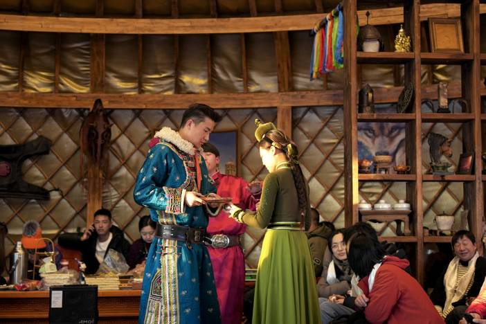 午餐后,我们到达【游牧体验园】,在这里可以放肆开玩,体验雪地爬犁冲浪、高山滑雪圈,参加蒙古族祭火大典,在暖喝的蒙古包内与热情蒙古人学蒙语、跳蒙古舞,观看群狼夺肉、马头琴表演,喂食草原精灵梅花鹿,品尝下马酒、奶皮子、奶豆腐,全方位感受蒙古族风情。