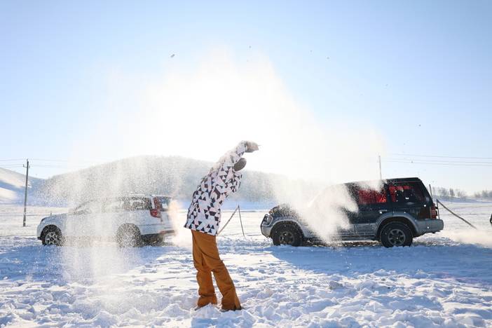 今天早起前往【小河头村】看日出,冬日的小河头依然有活水流淌,冰上有河柳灌木被冰雪覆盖,河水鼓泡冻成的冰花是这里的一绝,早晚雾气升起,极易形成雾凇。在这里感受冬季草原日出的壮丽,你可以看到雪中挺拔的白桦林,蜿蜒河流中洁白的雪馒头,小河头村风光、羊群出牧,你可以用手中的相机,定格冬季坝上的雪域风光。拿出准备好的保温杯,挑战【泼水成冰】,小伙伴们用手机拍下这神奇的一刻。
