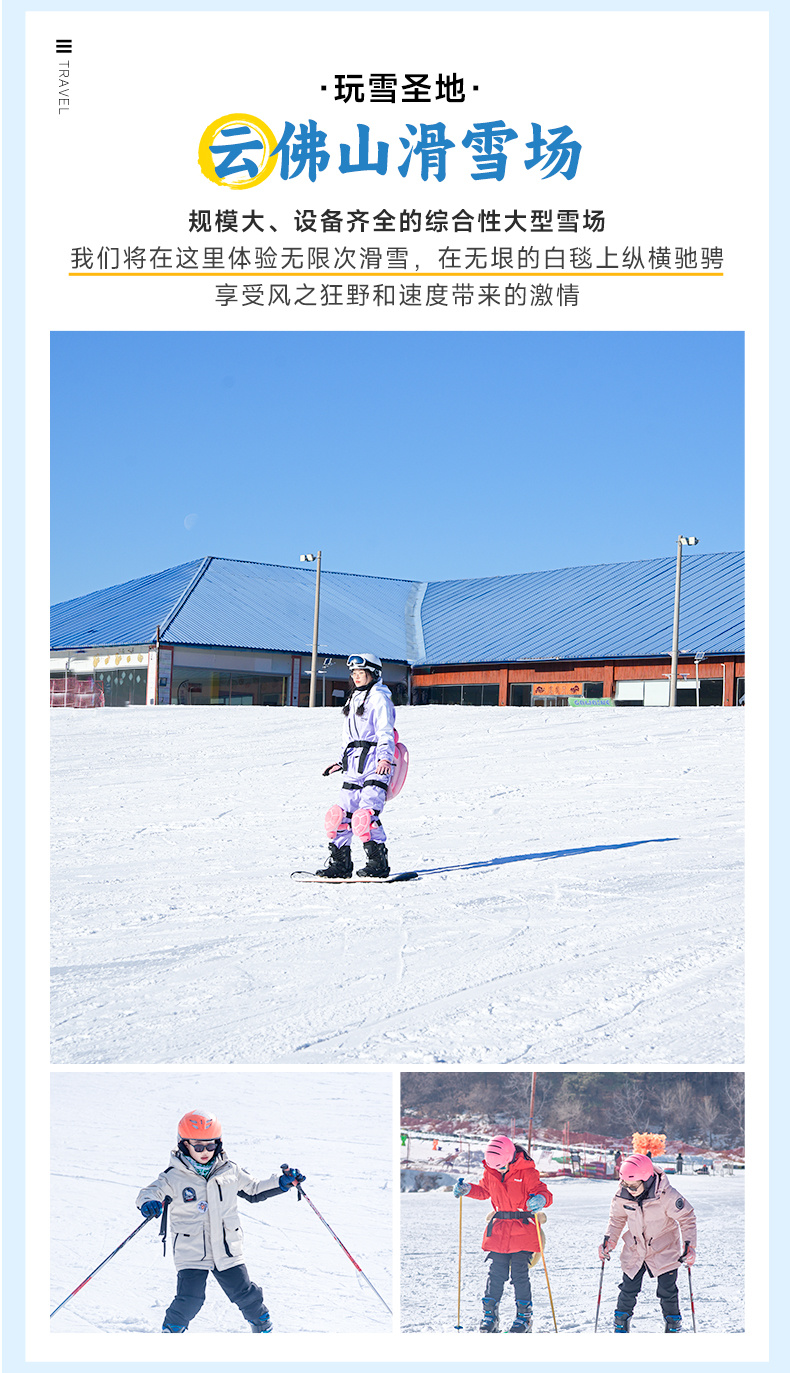 早餐后,我们出发前往【云佛山滑雪场】,这是华北地区规模zui大,设施齐全的绿色滑雪场,三面环山,环境优美,是一座集住宿、餐饮、会议、娱乐、健身为一体的大型综合性的滑雪旅游胜地,以孤山寨千危谷峭壁为舞,搭建起冰雪世界,用冰山、冰瀑、冰坡、冰花,塑造出气势磅礴的极地世界。