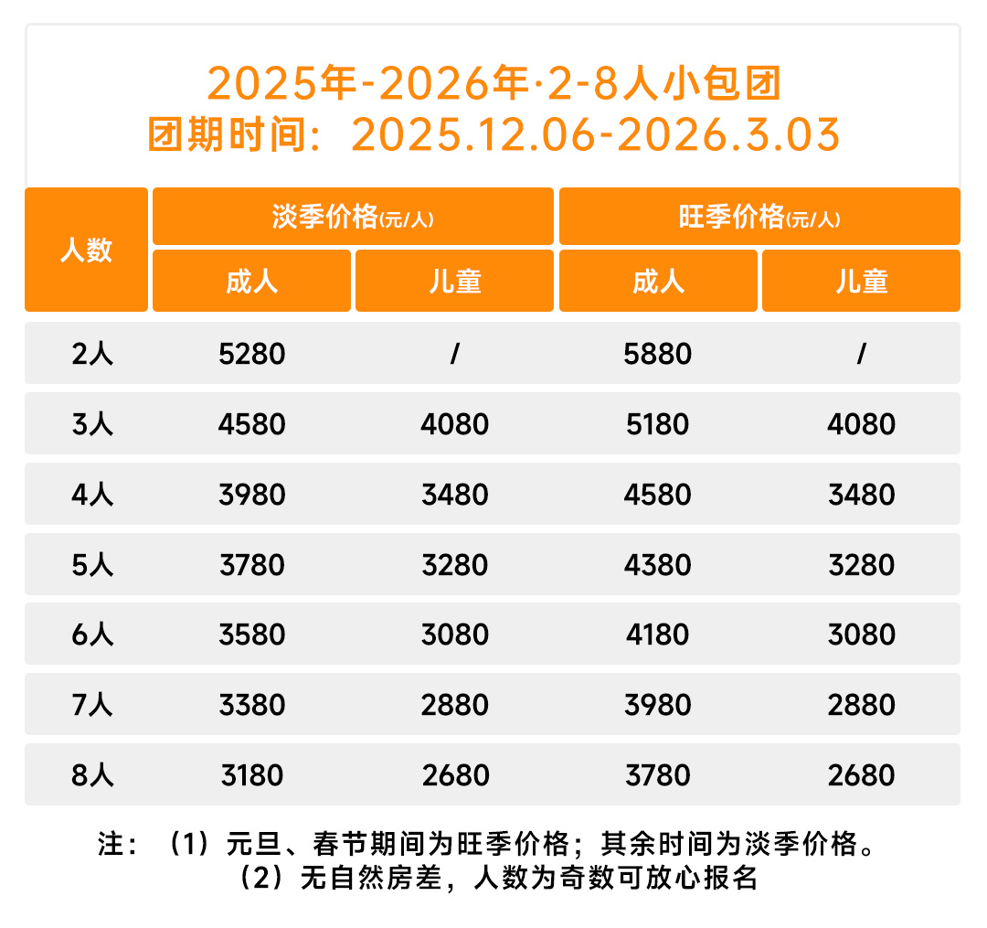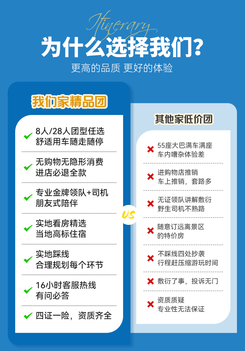 注:8人内司机兼向导(含8人),8人以上安排1名资深领队,15人(含15人)及以上安排摄影师跟团旅拍