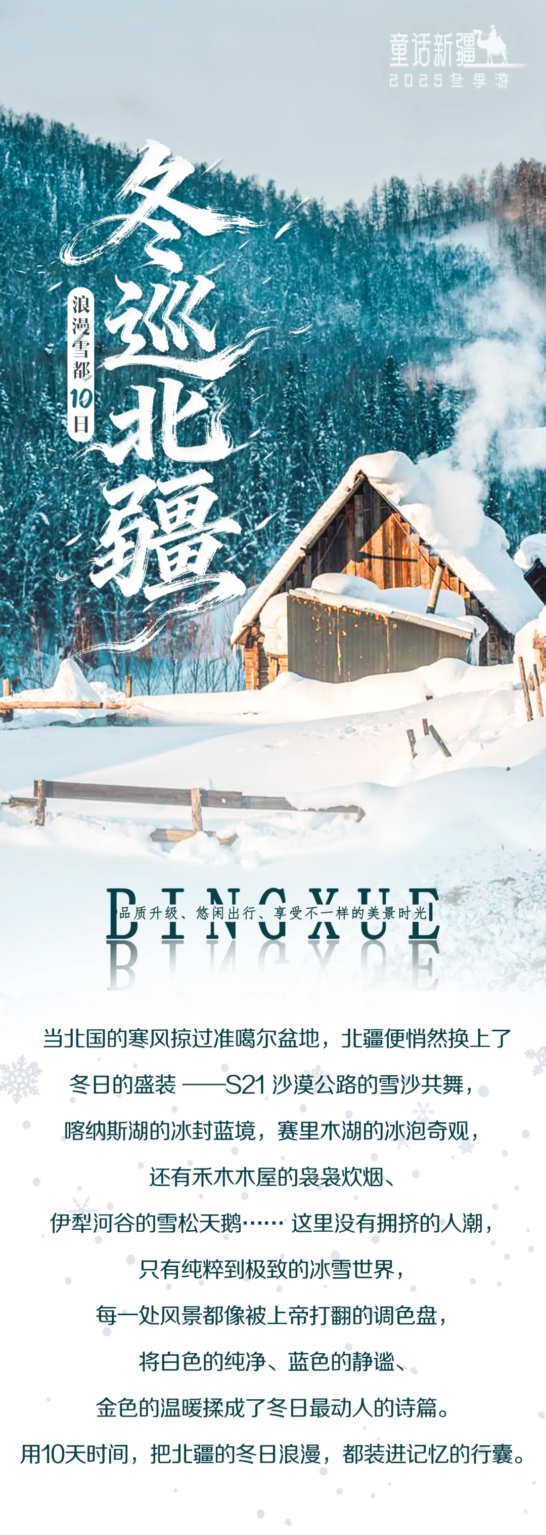 今日冬巡北疆10日之旅正式开启!早起乘车出发,沿着新疆首条沙漠高速公路——S21阿乌高速,一路向北穿越古尔班通古特沙漠。冬季的公路两旁,沙漠被白雪覆盖,形成 “雪裹黄沙” 的独特景观,途中在克拉美丽沙漠公园停留拍照。抵达雪都阿勒泰后前往将军山,坐着缆车上山,随着海拔升高,城市灯光像打翻的星河在脚下铺开,当夕阳跌进阿尔泰山的怀抱,粉橘色天际线从雪道尽头晕染整座雪场化作流动的金色油画,听着耳边动感的音乐,人世间的浪漫莫过于此。后前往酒店入住。