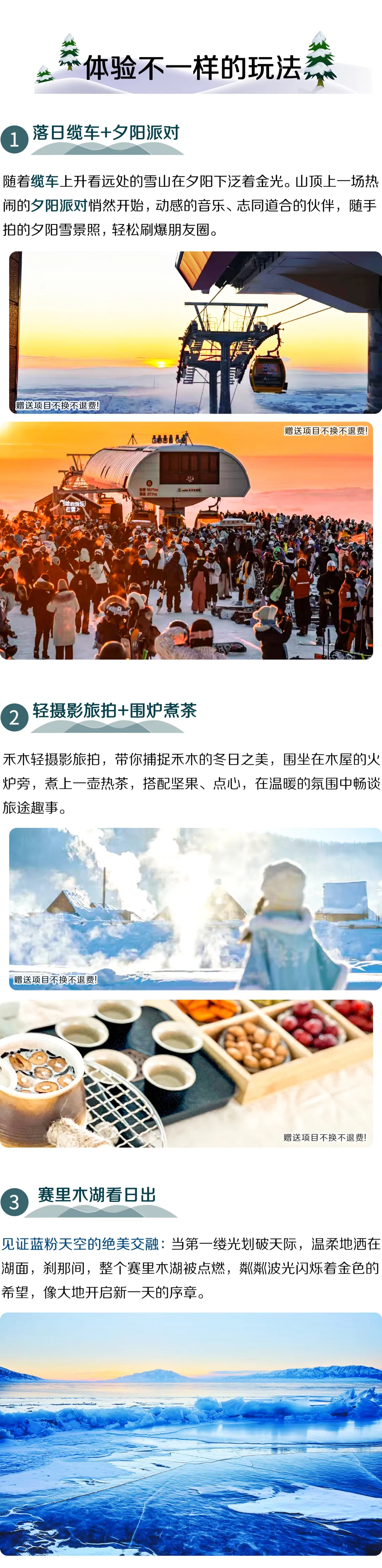 2.门票:全程景点首道大门票+区间车:禾木+白哈巴+喀纳斯门票套票(景区冬季只售卖套票,不去不退)、赛里木湖门票+自驾票、天鹅泉门票+区间车、库尔德宁门票。赠送将军山落日缆车,不去不退;
