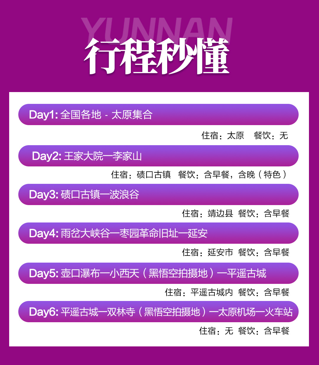 7点早餐后前往壶口瀑布,到达后游玩2小时,在这里你可以切身地感受到虎口的壮观,而且还会挂冰,一景两观的壶口景象,之后前往小西天(黑神话悟空拍摄地)原名千佛庵,始建于明崇祯二年(1629年),由东明禅师创建,内建有大雄宝殿、文殊殿、普贤殿等众多殿舍,以洞为门,分隔和连通各建筑群,建筑风格可用“小、巧、精、奇”概括,参观2小时,之后前往平遥古城,到达后安排入住酒店,由于古城很大,导游统一讲解游玩线路之后大家自由活动,在所有和晋地有关的故事里,它最让我着迷,在平遥古城,时间仿佛静止,每一砖每一瓦,都诉说着千年的故事。