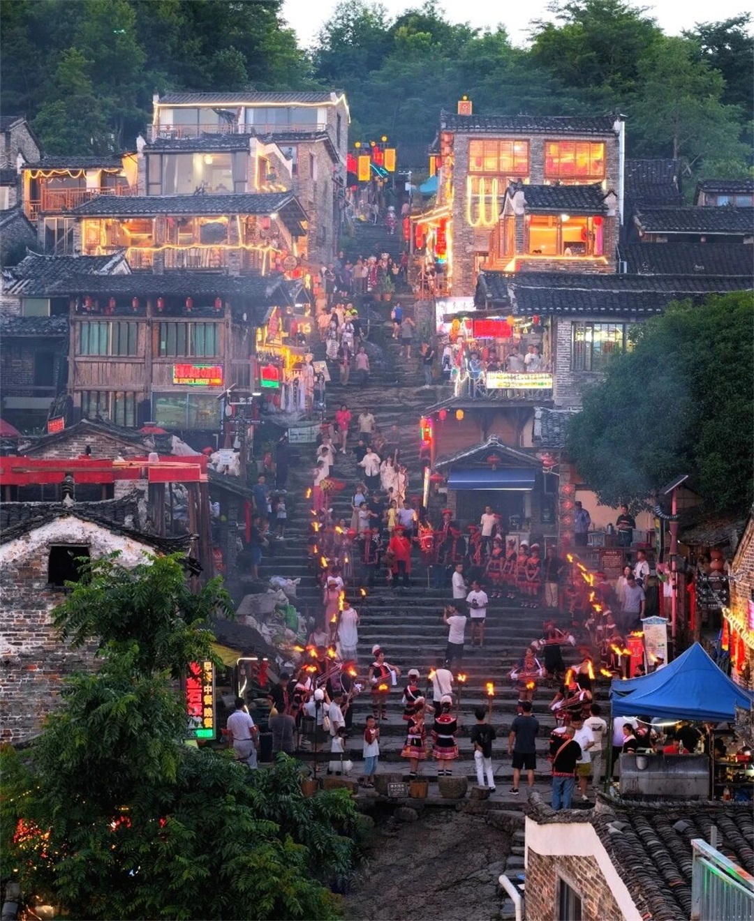 18:00 夜幕降临,跟随手持火把的瑶族同胞组成祈愿夜游队伍,形成一条流动的火龙点亮整个瑶寨。或自费前往篝火晚会会场,欣赏瑶寨歌舞表演,与瑶族"阿贵"及"沙腰妹"对饮瑶酒,手拉手共跳瑶家舞