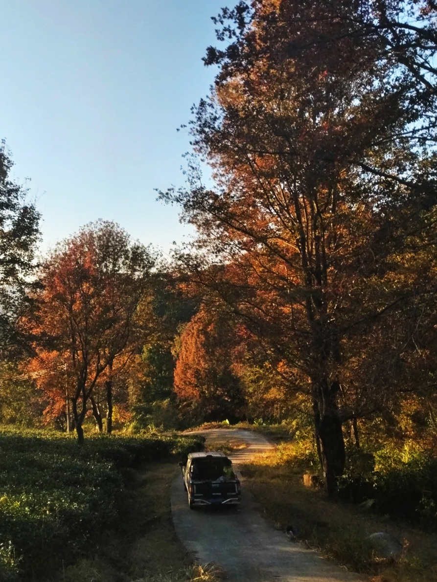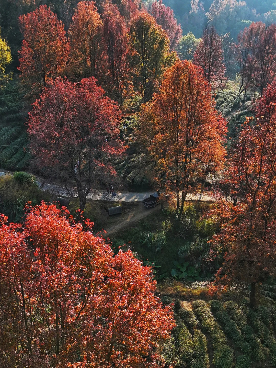 11:00 陆续到达【“无量山”红枫茶园】,上百株枫树点缀在茶园之间,黄绿、金黄、橘黄、火红、紫红,层林尽染,与云南无量山的樱花茶园相媲美。漫步其间,随手成片;或是沏一壶好茶,慵懒地欣赏风景。这里生态原始,没有餐厅饭店,小伙伴记得提前备好干粮哦。也可以帮采茶工人除草,用劳动换工作餐