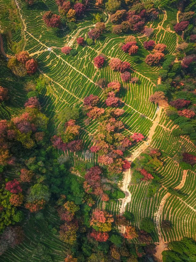 广东“无量山”:上百株枫树点缀在半山茶园之间,漫山层林尽染,枫情熠熠,抓一抓秋天的尾巴