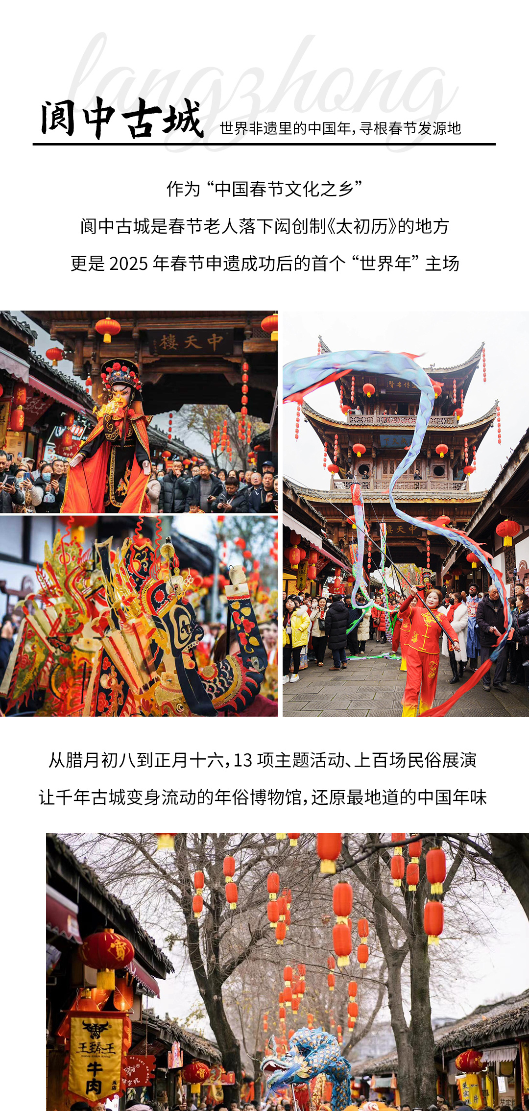 踏入“中国春节文化之乡”,古城红灯笼高挂,年味浓郁。可自行游览张飞庙、贡院(门票自理),可体验写春联、剪窗花等传统活动,感受原汁原味的巴蜀年俗。春节特供的保宁醋宴,让文化之旅更添风味。
