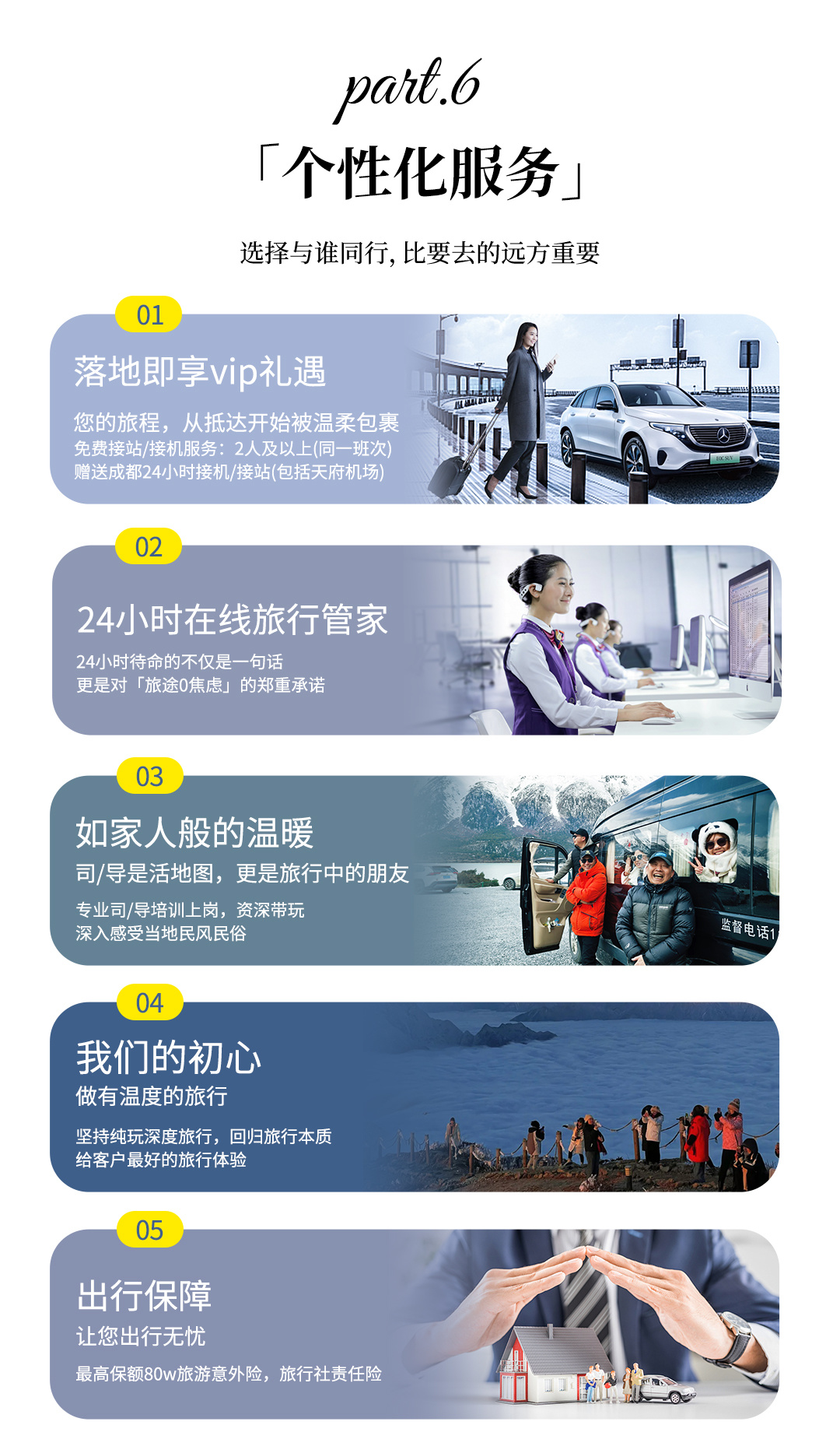 3、领队:1-7人全程司机兼向导,8人起安排专业持证导游全程服务。