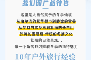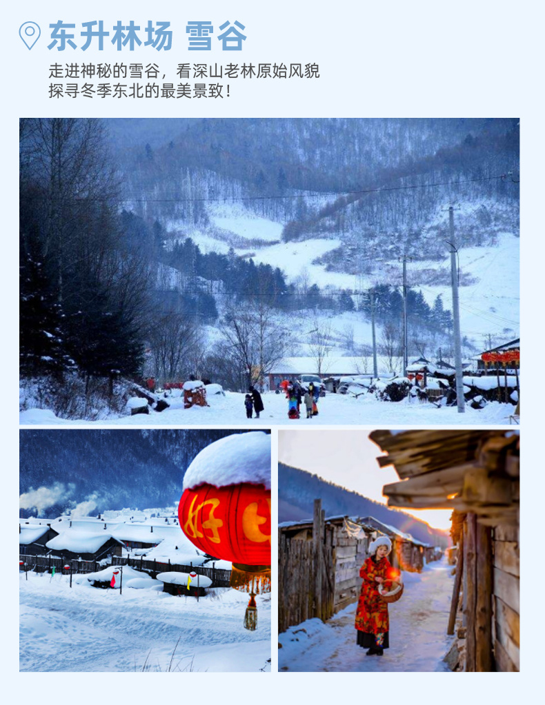 备注:【寒地冬捕】【雪上飞龙】【泼水成冰】等雪上活动12月中旬冰面封冻体验;如不能玩冰上活动会替换成朝鲜族民俗村。