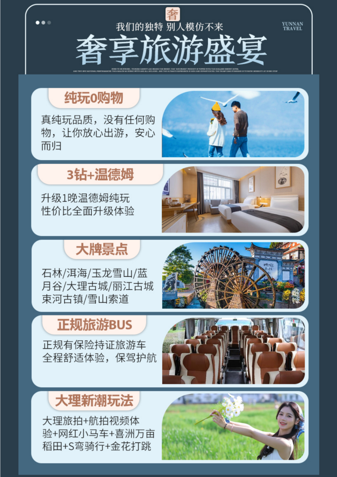 7、安全:旅行社为游客购买云南旅游组合保险(旅行社责任险),赠送个人旅游意外险50W保额;