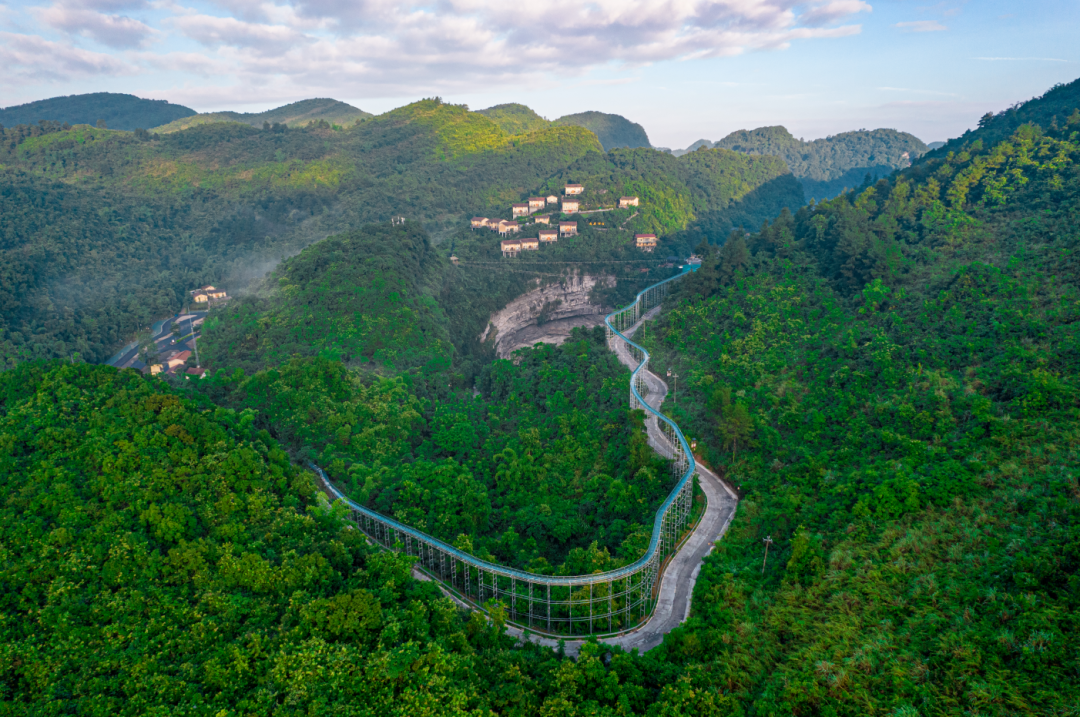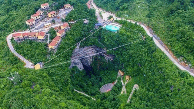 棉花天坑,深326米,宽305米,形似大型漏斗,一削千丈的绝壁直插地下,栈道在悬臂上盘旋引向坑底,犹如地球表面与地宫世界的连接口,险、奇、峻、雄、秀、美!置身其中,如入秘境。