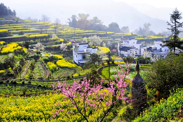 走进婺源江岭,处处是粉红的桃花、洁白的梨花与层层金黄的梯田油菜花、白墙黛瓦的民居相辉映,构成一幅幅唯美的天然画卷。