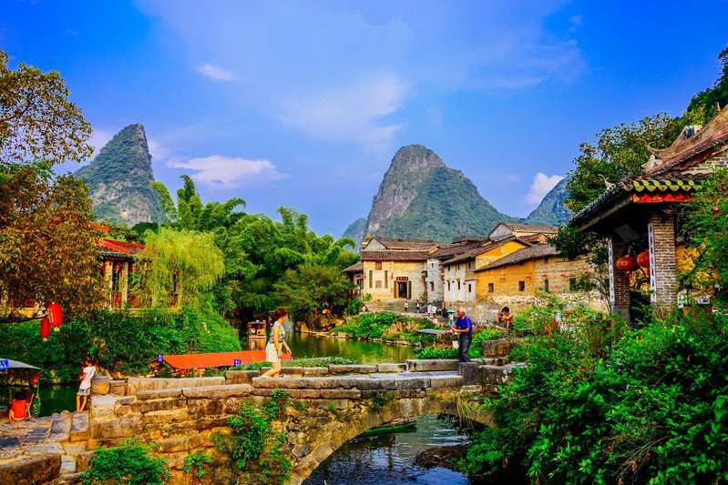 漓江上一颗璀璨的明珠,位于阳朔县东北部,距阳朔25KM。20元人民币的背景地就是在兴坪。具有1700多年历史,各类砖瓦结构的古建筑大部分保存完好,古街的东南侧狮子旦为熙平县城遗址,城墙轮廓尚清,随处可见古砖瓦陶瓷残片,只是原来车马来往人看人的繁华县城,呈现出一派青山幽幽、村舍几座的肃静氛围。
