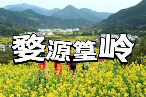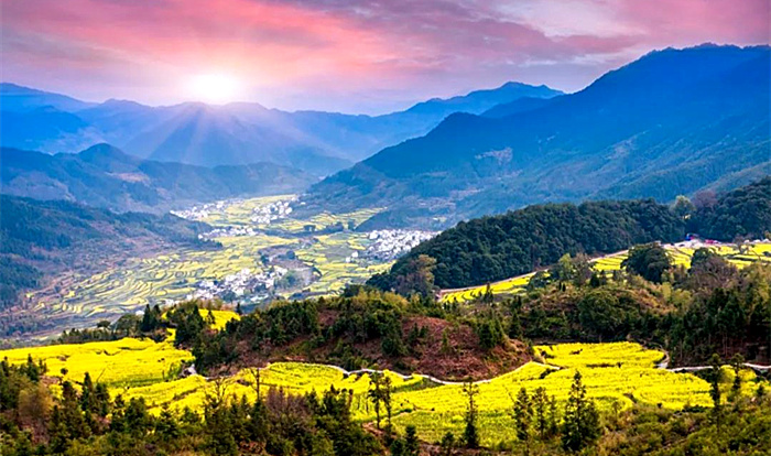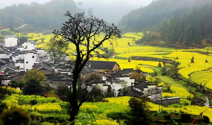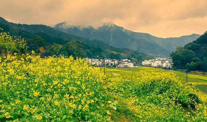 江岭漫山遍野的油菜花呈梯田状,从山顶铺散到山谷下。站在山顶望去,油菜花层层叠叠,一望无际,中间围拢着几个小小的村落,黑瓦白墙的徽派民居夹杂在一片金黄之间,在婺源再没有比这更壮观而令人惊喜的了。