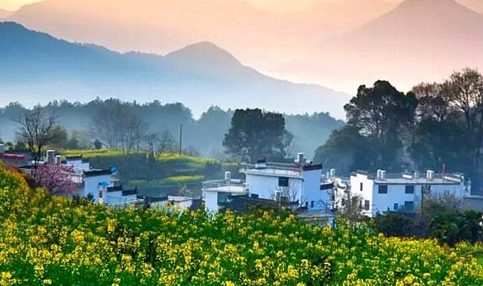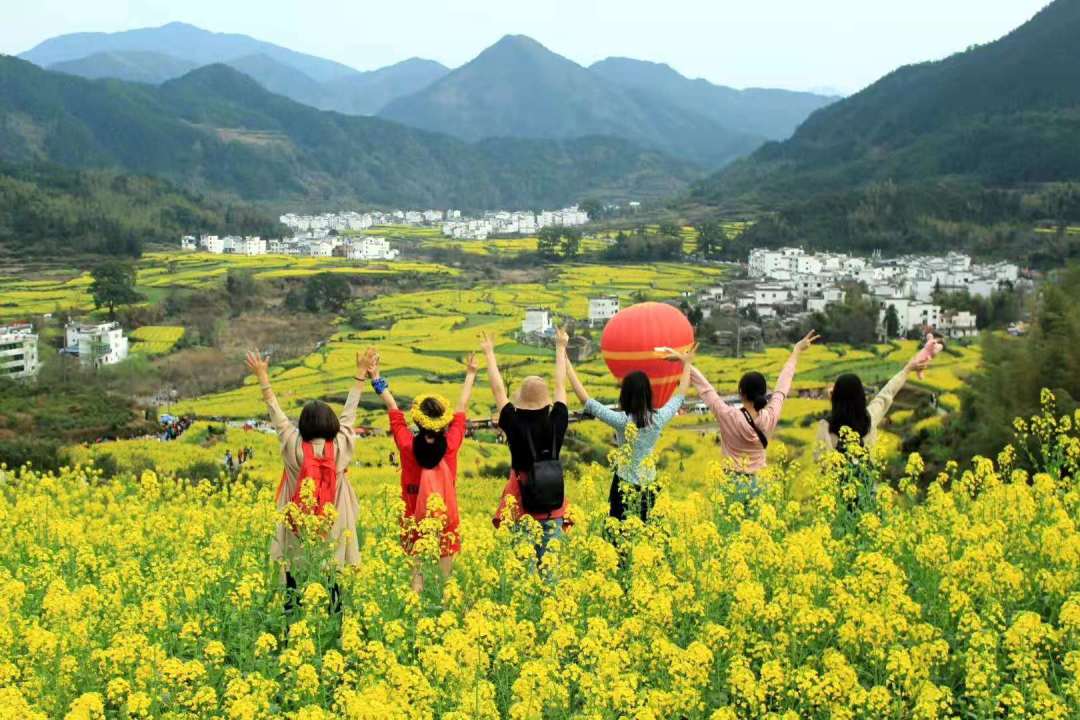 成片的金黄色油菜花与粉墙黛瓦的徽民居