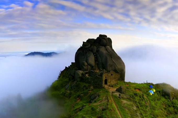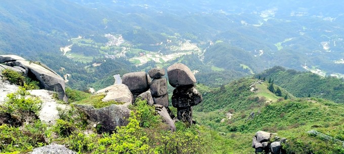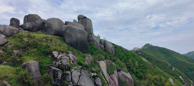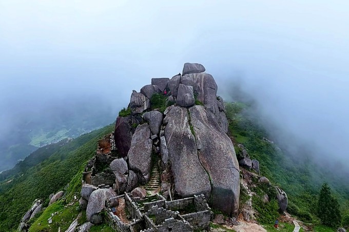 山上怪石嶙峋,巨石奇绝。其中尤以顶部巨石--团山石和稍凹处的三重塔最为妙绝。顶部巨石高达约8米以上成不规则圆体。三重塔是以三块重约数十吨的巨石天然叠合而成,底部小而上部大,巍巍欲坠,动人心魄。更奇妙的是这样的叠石不只有一而有三,三三得九共九块怪石叠成三列, 前两列石头相互依托,第三列则突兀凌空,悬而不掉,令人拍案叫绝。