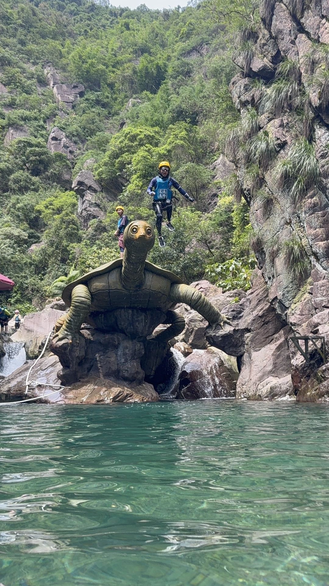 溪降之王位于玄真漂流赛道上游的玄真大峡谷中,溪降路线环绕海拔超600米高山中的深邃溪谷,挑战全长3850米,总落差465米的专业路线,全程6个水滑梯、5个可降瀑布、5个跳潭(1个必跳)。