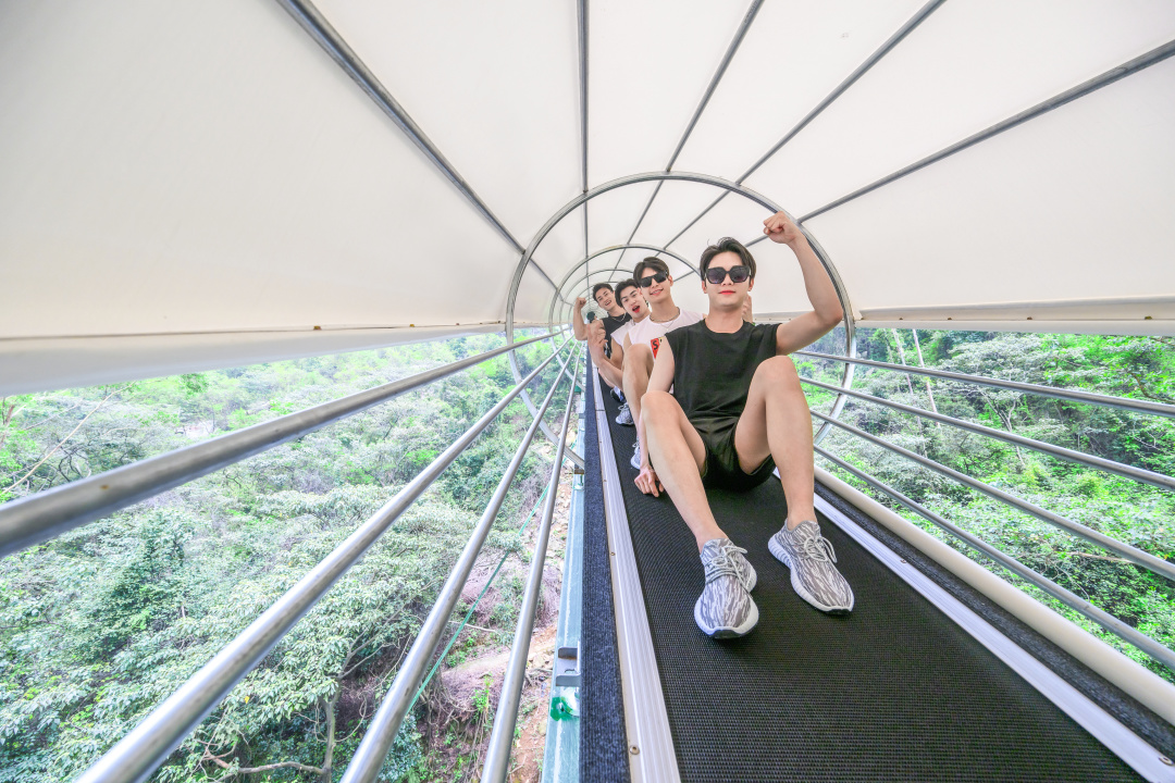 悬崖全程漂:全长6066米,超时速70公里,360度凌空回旋,极速体验,创单体落差最大漂流的世界纪录。