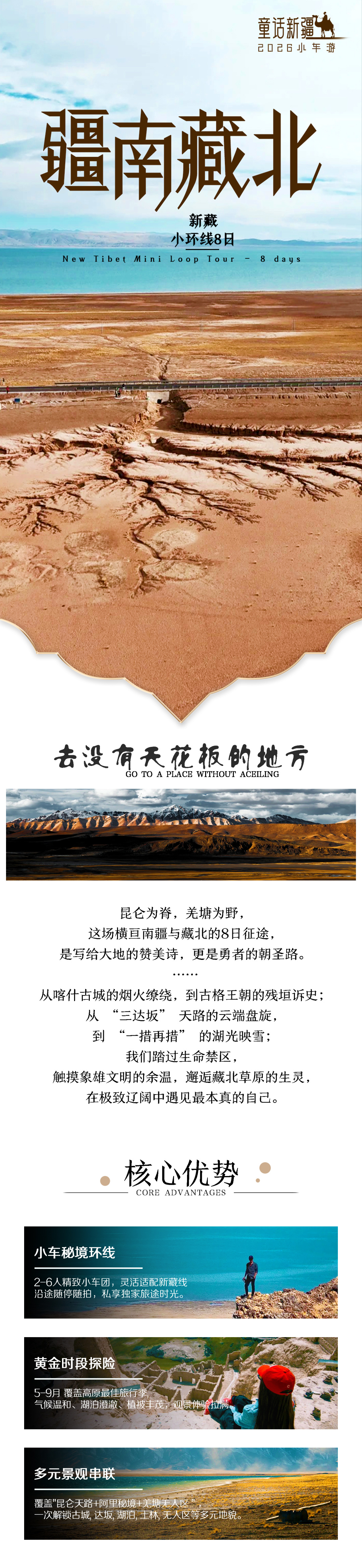 今日早早出发,纵穿羌塘无人区,行走在国道216新藏二线上。这条公路的贯通是一个超级工程:它是全球平均海拔最高、途径无人区距离最长、落差最大的公路。这条公路是真正在世界屋脊之巅的公路,从改则前往民丰,海拔逐渐下降,看似荒凉的羌塘高原,实际上是一处资源的宝库:丰富的油气资源,野生动物的天堂,一路上依旧是一“措”再“措”,例如骆驼湖、月牙湖、黑石北湖......各有特色,极为美丽。晚抵达民丰酒店。