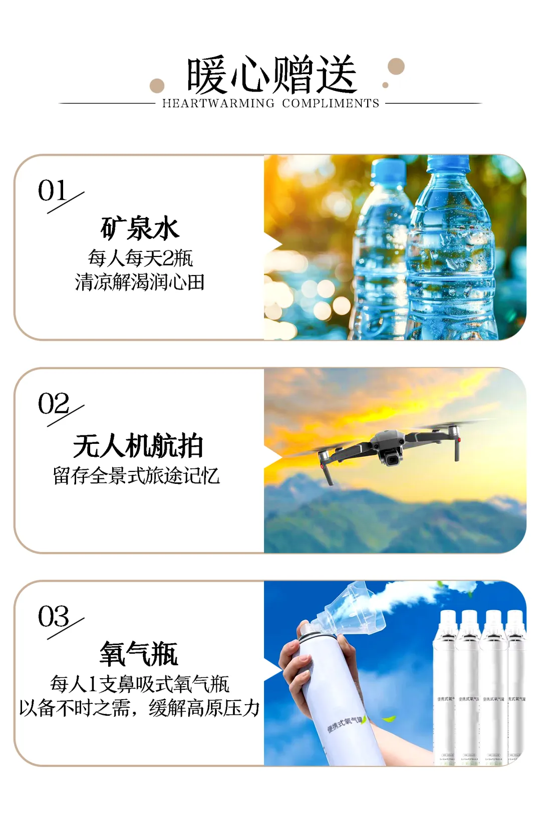 (2)药品类:请结合个人的身体情况和需求,准备个人常用药;同时请准备:感冒药、止泻药、肠胃药、防蚊水、创可贴、压缩氧气罐、高原安片剂、布洛芬缓释胶囊 (应对高原低烧、头痛)、葡萄糖口服液(补充体力)、晕车药、速效救心丸等急救药物。可以选备:西洋参含片(有助缓解疲劳的药物)、云南白药。特别提示:如服用红景天(建议口服液),且在抵达高原前15天开始服用。