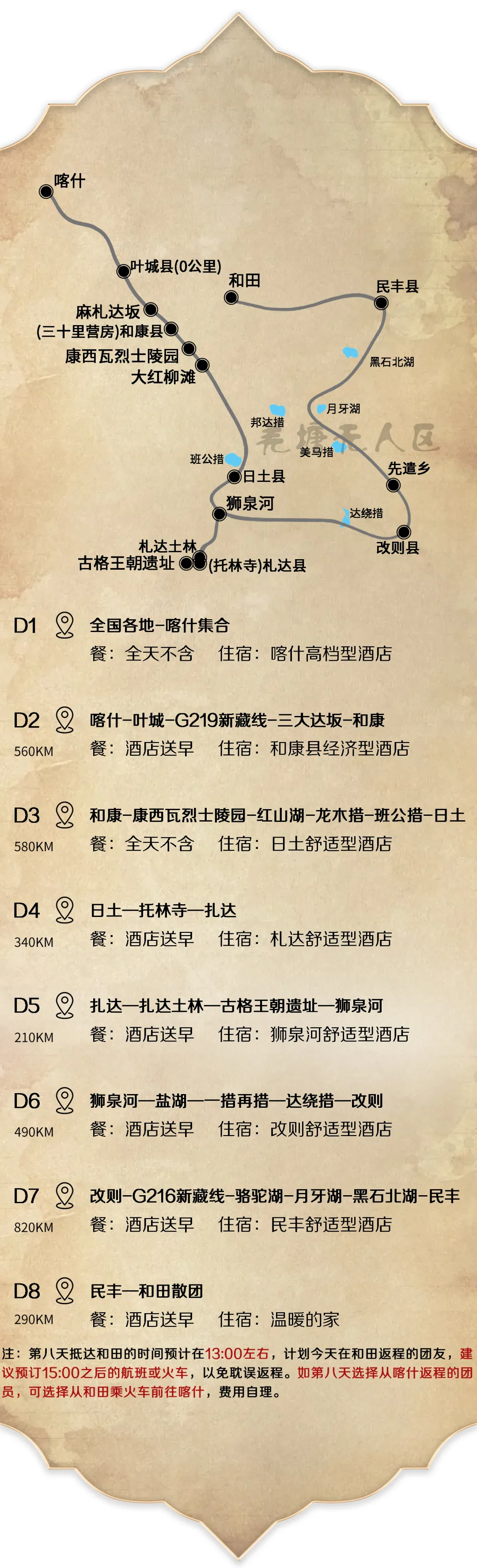 2. 抵达和田的时间预计在13:00左右,计划今天返程的团友,建议预订15:00之后的航班或火车,以免耽误返程。