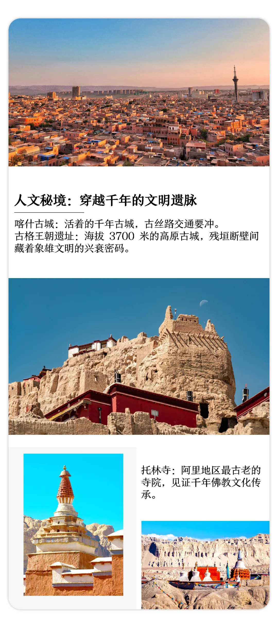 2、门票:全程景点首道大门票:托林寺门票、扎达土林门票+区间车、古格王朝遗址门票+区间车。
