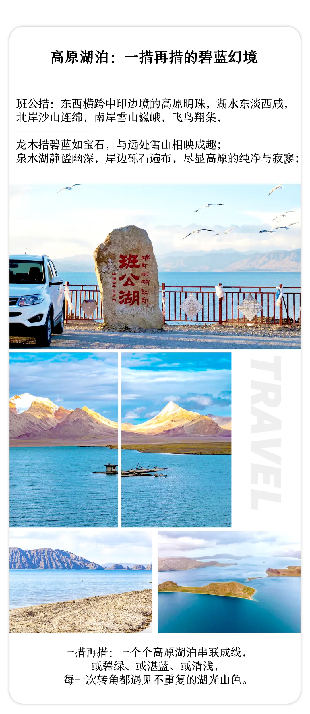 今日早起告别和康向日土出发,先抵达康西瓦烈士陵园,瞻仰烈士墓碑,聆听英雄事迹。过了奇台达坂,红山湖映入眼帘,湛蓝的湖面波澜不兴,水平如镜。作为新藏线上从第一个遇见的湖泊,红山湖以其秀美的风光吸引了无数人。前方是泉水湖,周边雪山环绕,湖水静谧,绝对的高原屋脊,无可比拟。后抵达龙木措,龙木措是一座形似葫芦的盐湖,一般只有走新藏线才会看到龙木措,让看到它的人,体验到了黄沙戈壁中,湖泊千姿百态的样子。忽而一个转弯班公措如天降圣湖,该湖大部分在我国境内,少部分属印控克什米尔的中国故土拉达克藏区。有意思的是,班公措在中国境内是淡水湖而在印度境内则是咸水湖。著名的高原鸟岛也在该湖之中,每年5-9月份,班公湖鸟岛成为西藏最佳的观鸟点,抵达日土后前往酒店入住。
