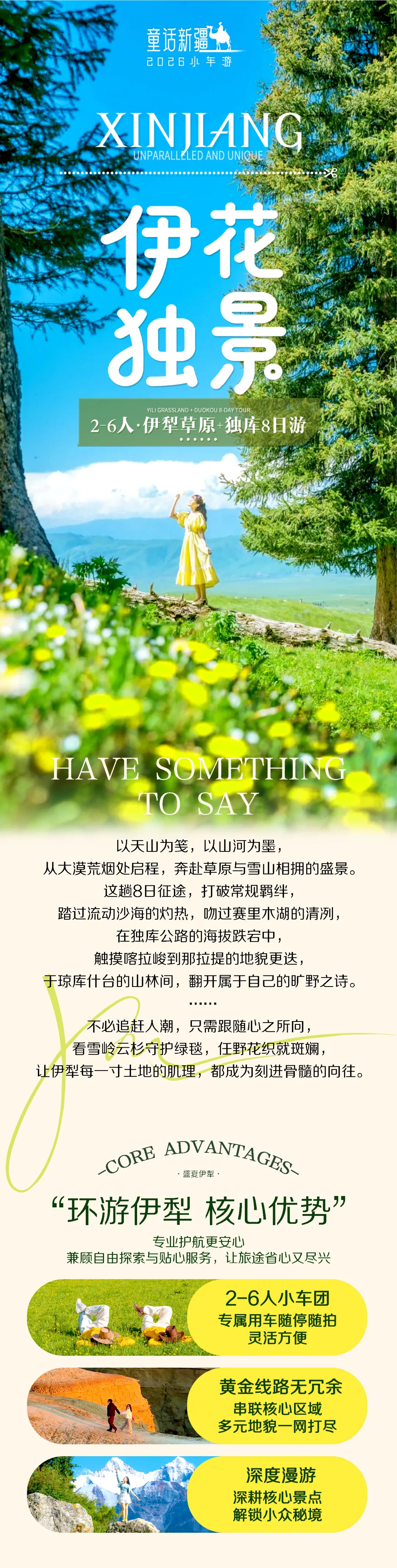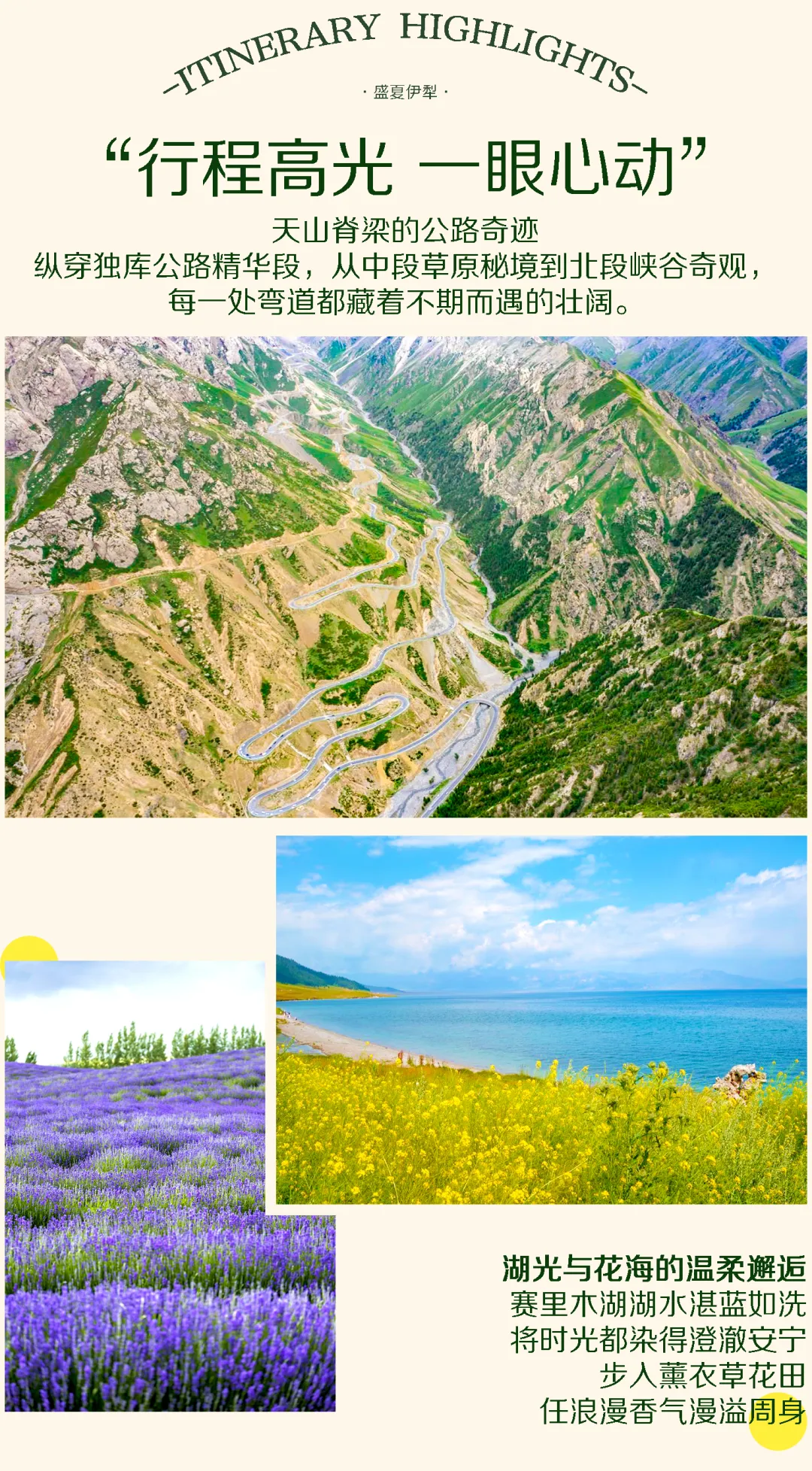 2. 独库公路沿途景色绝美,山路蜿蜒曲折,乘车请系好安全带,下车拍照时请注意来往车辆,确保安全。