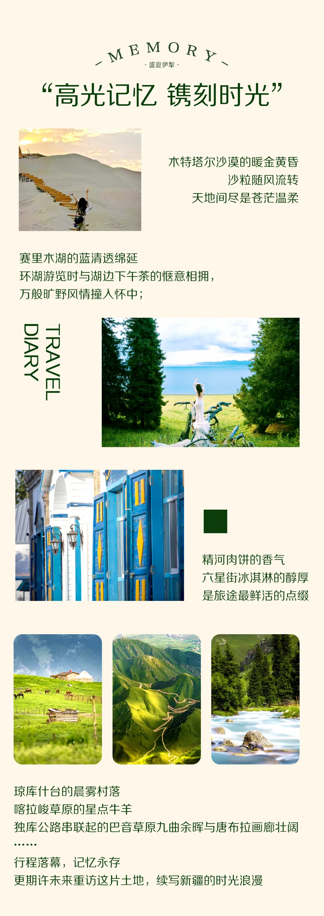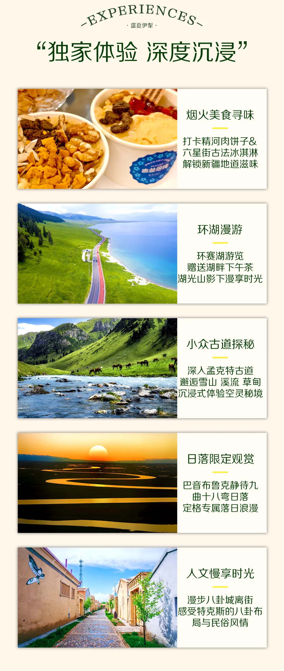 今日出发去往素有“大西洋最后一滴眼泪”之称的赛里木湖(不换车畅玩赛里木湖)。在群山怀抱之下,赛里木湖就像一个安静的仙女,阳光下湖水蓝的耀眼,湖畔绿草如茵,涌动的牛羊好似流云,让你醉倒在这迷人的美景中。后在湖畔享用下午茶,茶点搭配雪山湖泊风光,惬意十足。后去往薰衣草花田游玩拍照,途中车观果子沟大桥和果子沟风光。每年的六七月份正是薰衣草最美的时节,换上鲜艳的衣裙,漫步在紫色的花海中,尽情玩耍和拍照。后前往伊宁六星街,淳朴的民风、吃不完的美食、随处可见的美景,还有像极了童话照进现实的彩色房子,每一扇门窗都值得路过的人驻足欣赏,赠送品尝六星街古法手工冰淇淋,后前往酒店入住。