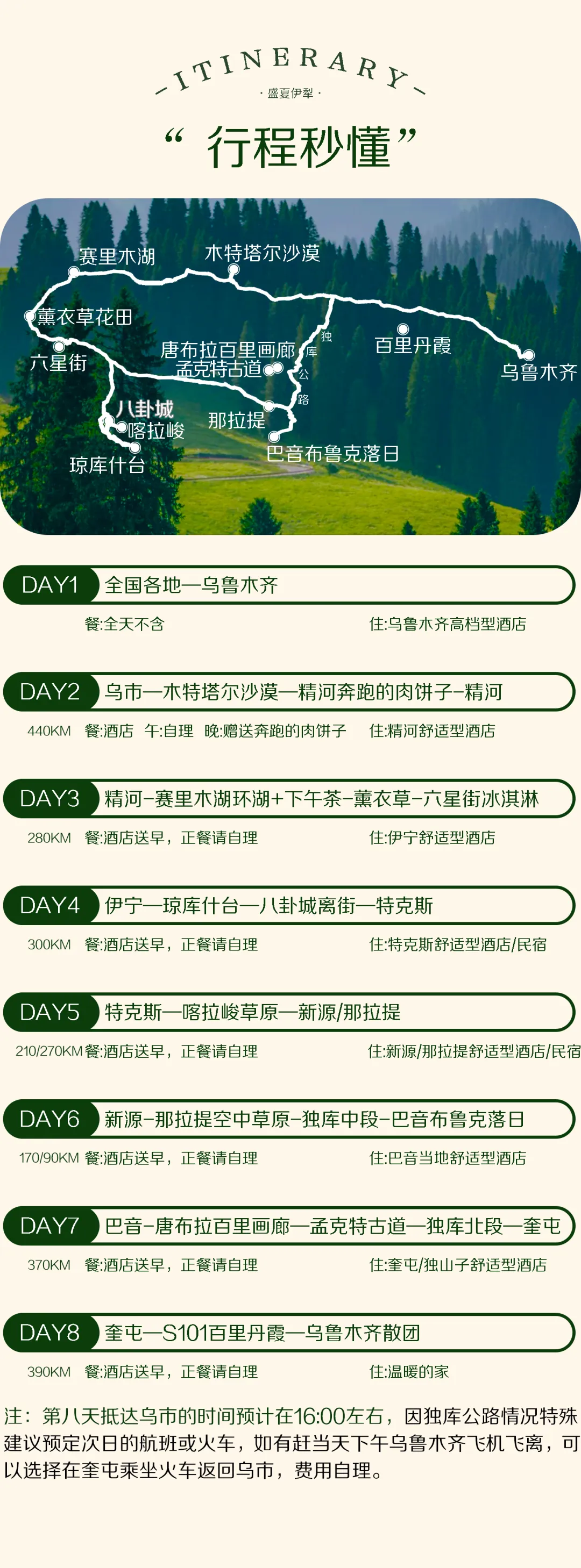 2. 抵达乌市的时间预计在16:00左右,因独库公路情况特殊,建议预定次日的航班或火车,以免耽误返程;如果赶当天下午乌鲁木齐飞机飞离,时间上比较紧张的团友,可以选择在奎屯火车站乘坐火车返回乌市,后前往乌市国际机场,火车票及交通费用请自理。