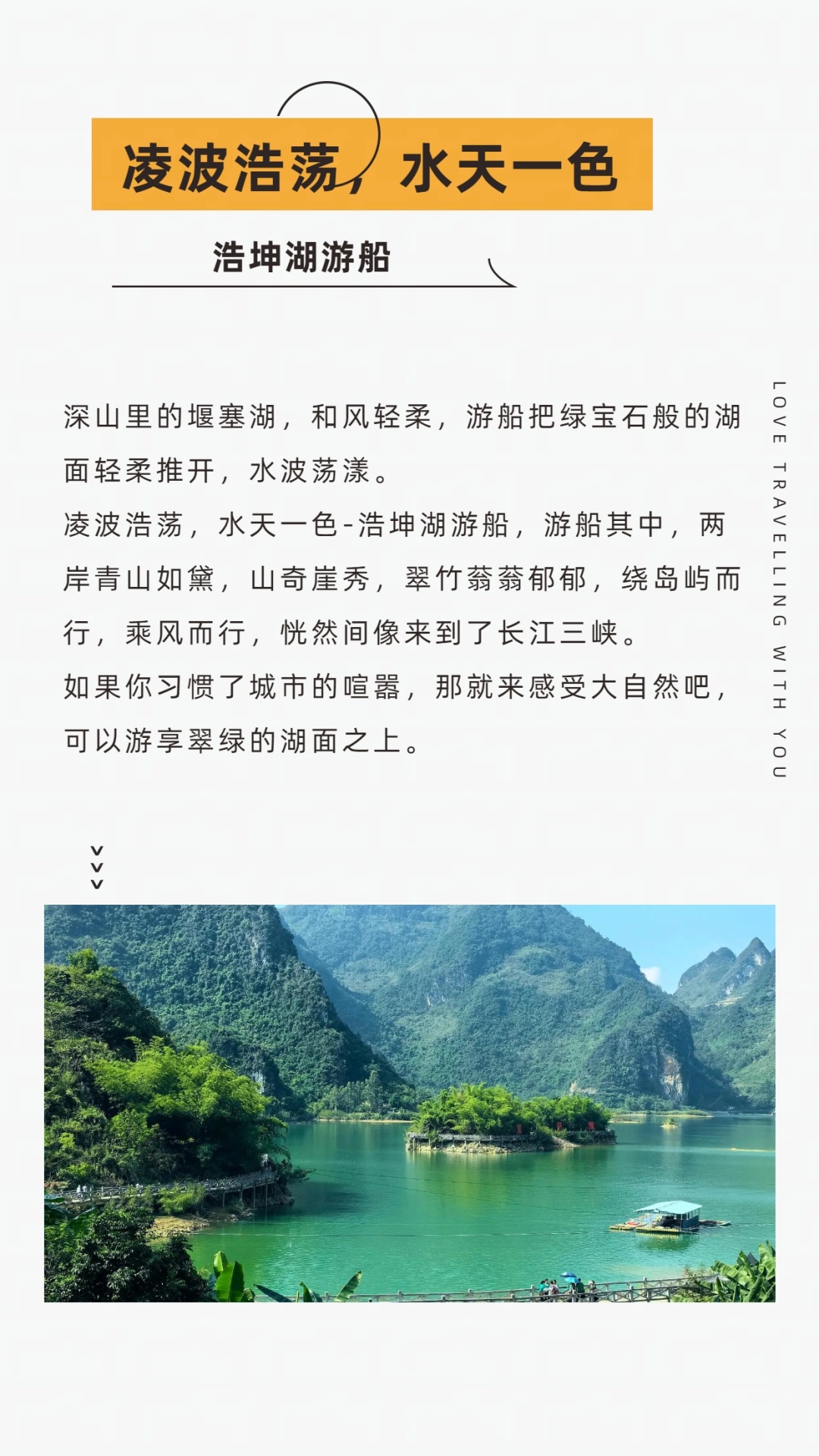 下午,我们一起乘船游湖,来了浩坤湖,乘船游湖是必不可少的一环,烟波浩淼的湖面,倒影着朵朵白云,悠闲的生活就该如此安逸!湖上有很多迷你小岛,有的布满芳草,有的竹林丛丛,有的上面还保留着老房子,像一个个湖中盆景。游船后,我们坐上包车继续去环湖,到了漂亮的观景台,可以随时下车拍照。